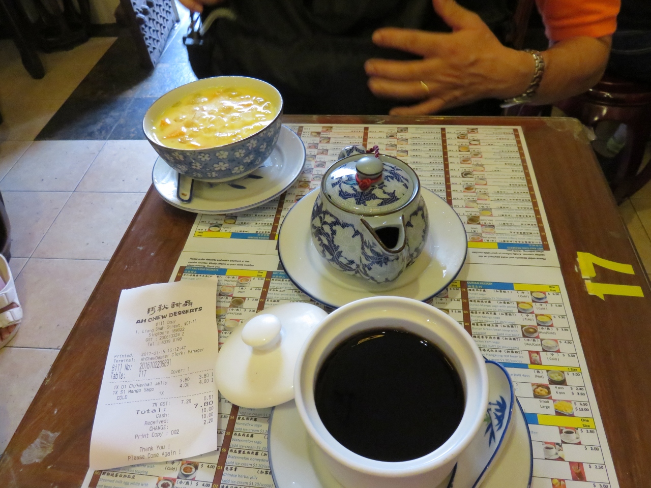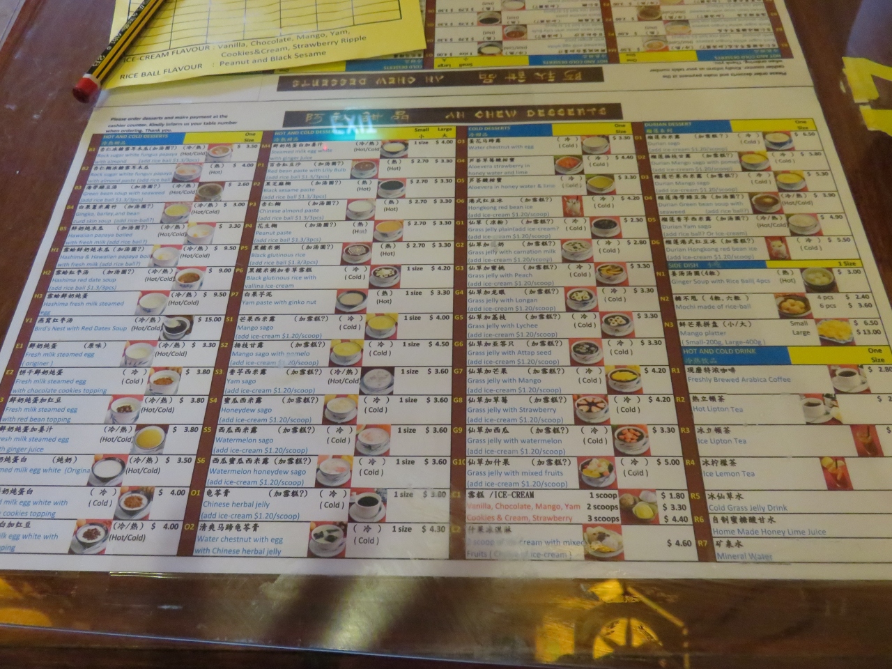 ランチの後何かデザートでも食べようとガイドブックを見て評判が良さそうな「アーチューデザート」へ行きました。MRTブギス駅のD出口から2~3分ですが看板が小さくて直ぐに見つかりませんでしが、人気店なのでお店にはお客が溢れているのでわかりました。席に案内されてメニューを見ると種類の多さにビックリ、日本語も無いのでなかなか選ぶ事が出来ず、定番のマンゴーサゴと亀ゼリーにしました。席にオーダーを取りに来ると思っていたら注文はレジまで行って先に会計を済ませるシステムでした。冷たいマンゴーサゴは小粒な氷が入っていて暑いシンガポールにぴったりです。亀ゼリーは、もっと漢方薬っぽいのかなと思っていましたがそんな事もなく食べ易かったです。