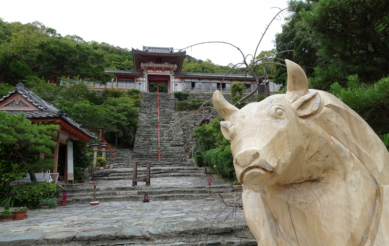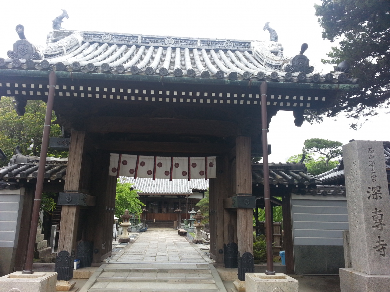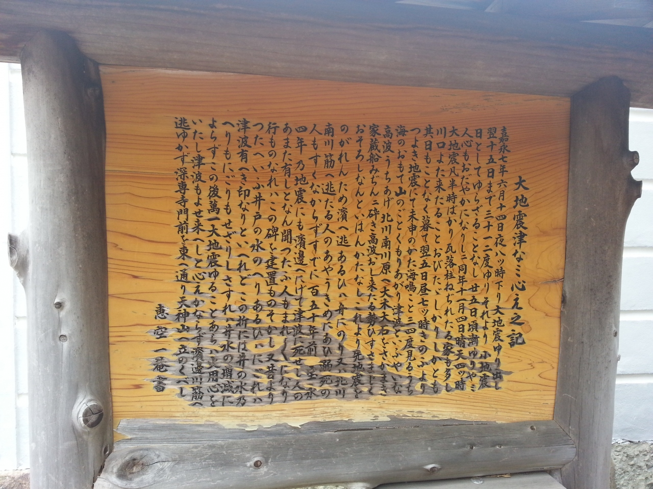 湯浅に仕事で出張した際に訪問しました。街中,熊野古道の沿道近くにある西山浄土宗のお寺です。山門の左側に,1854年(嘉永7年・安政元年)に連続して起こった「安政東海地震」と「安政南海地震」に関する「大地震津なみ心え之記」という記碑があり,地震が起こったら,火の用心をして,津波がすぐ来るものと考えて天神山に避難すべしという訓戒が記録されています。また,山門の右側の塀の内側には,「ねじき」という大木があり,ねじれた幹が勇壮でした。県の文化財に指定されている本堂は,屋根の上に大きな鯱をいただいたなかなか立派なものでした。