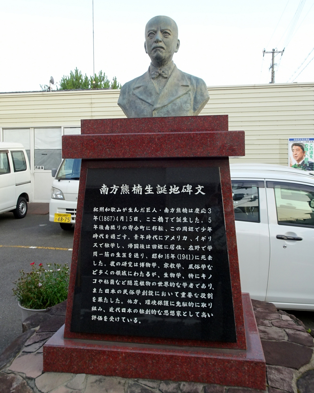 和歌山市駅から水門吹上神社まで行ってみた際,途中,偶然に傍を通り遭遇しました。南方熊楠といえば,博物学,生物学,風俗学など多分野での研究で知られる,和歌山では郷土の英雄的存在です。その生誕地ということで,その活躍を記した碑文とともに胸像が設置されていたのですが,道端にひっそりと置かれているだけで,公園的な整備はされておらず,気付かずに通り過ぎてしまうのではないかと思うようなポイントでした。残念な感じです。