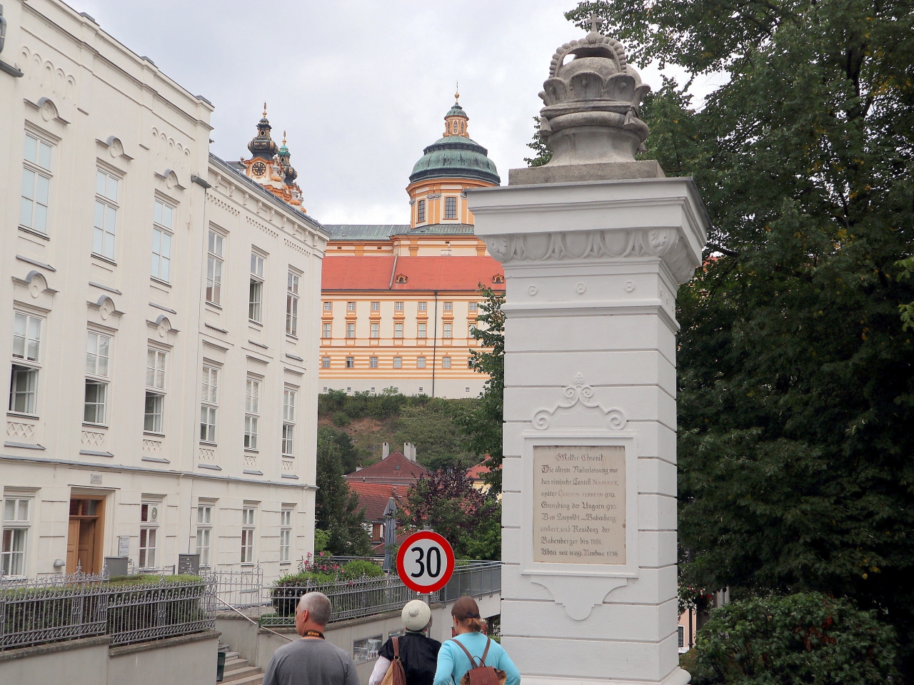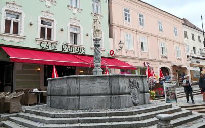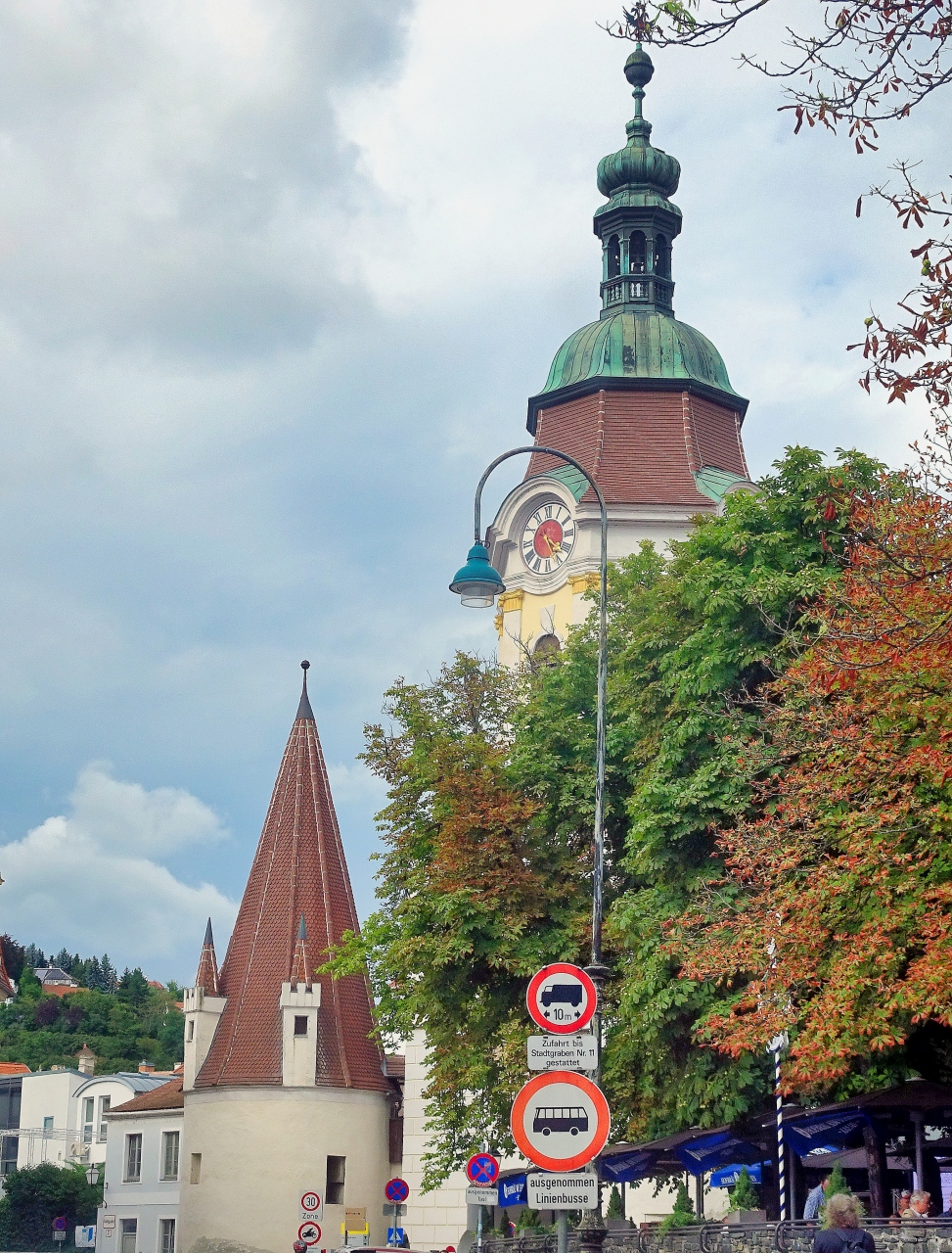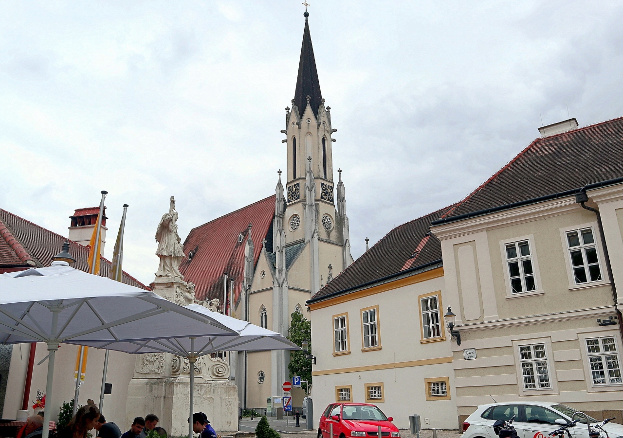 メルク修道院の南,ハウプト通りがクレムザー通りとリンツァー通りと交わる広場。広場の東側に,十字架を掲げ頭上に5つの星が輝く聖人像があります。調べてみると,チェコでよく見かけた,ネポムクの聖ヨハネ(聖ヤン・ネポムツキー)の記念碑のようです。お店のテラス席のビニールのパラソルが傍に置かれ,ミスマッチでした。ここから,教区教会の聖母被昇天教会の尖塔も見ることができます。訪問時,広場の(モミジバ)スズカケノキが実を付けていました。