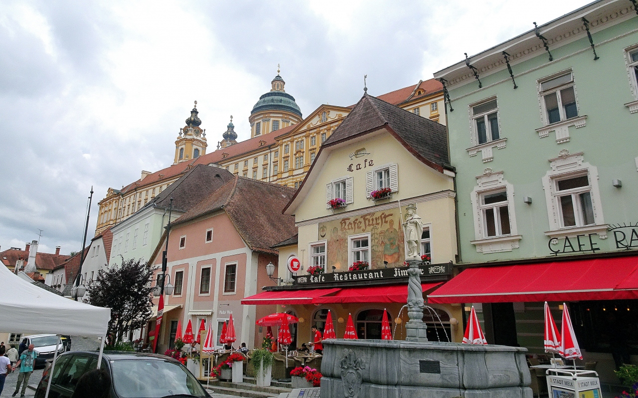 メルク修道院の南側に,修道院の建物と平行に通る目抜き通りで,おみやげ物や飲食店など各種のショップが軒を連ね,ウインドウショッピングも楽しい通りです。市庁舎の前は広場になっており(ラートハウス広場),噴水なども見られます。