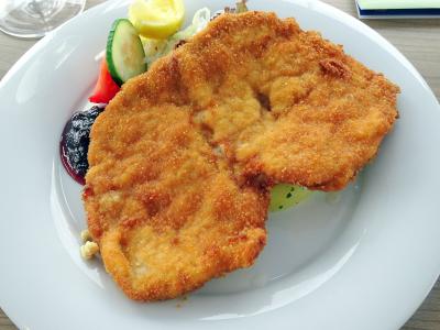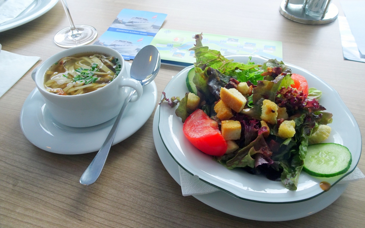 メルクからデュルンシュタインまでのドナウ川クルーズを楽しみました。ランチクルーズで,乗船後すぐにランチが開始。前菜とメインをそれぞれ2種類からチョイスするスタイルで,家内とそれぞれ別のものを選び,4種類の料理をいただきました。前菜は,細切りクレープ入りコンソメスープ又はサラダ,メインは,シュニッツェル(ポテトサラダ&ベリー添え)又は岩魚のフィレ(ポテトサラダ添え)で,いずれも美味しくて満足しました。途中,川に沿って「ドナウの女王」と詠われるシェーンピュール城,山上に立つアックシュタイン城,廃城ヒンターハウス城,クエンリンガー城などの古城や,防衛教会として城塞化された聖ミヒャエル教会,聖マリア被昇天教会などを眺め,デュルンシュタインのシンボルの青の鐘楼を船上から写真に収めることができました。