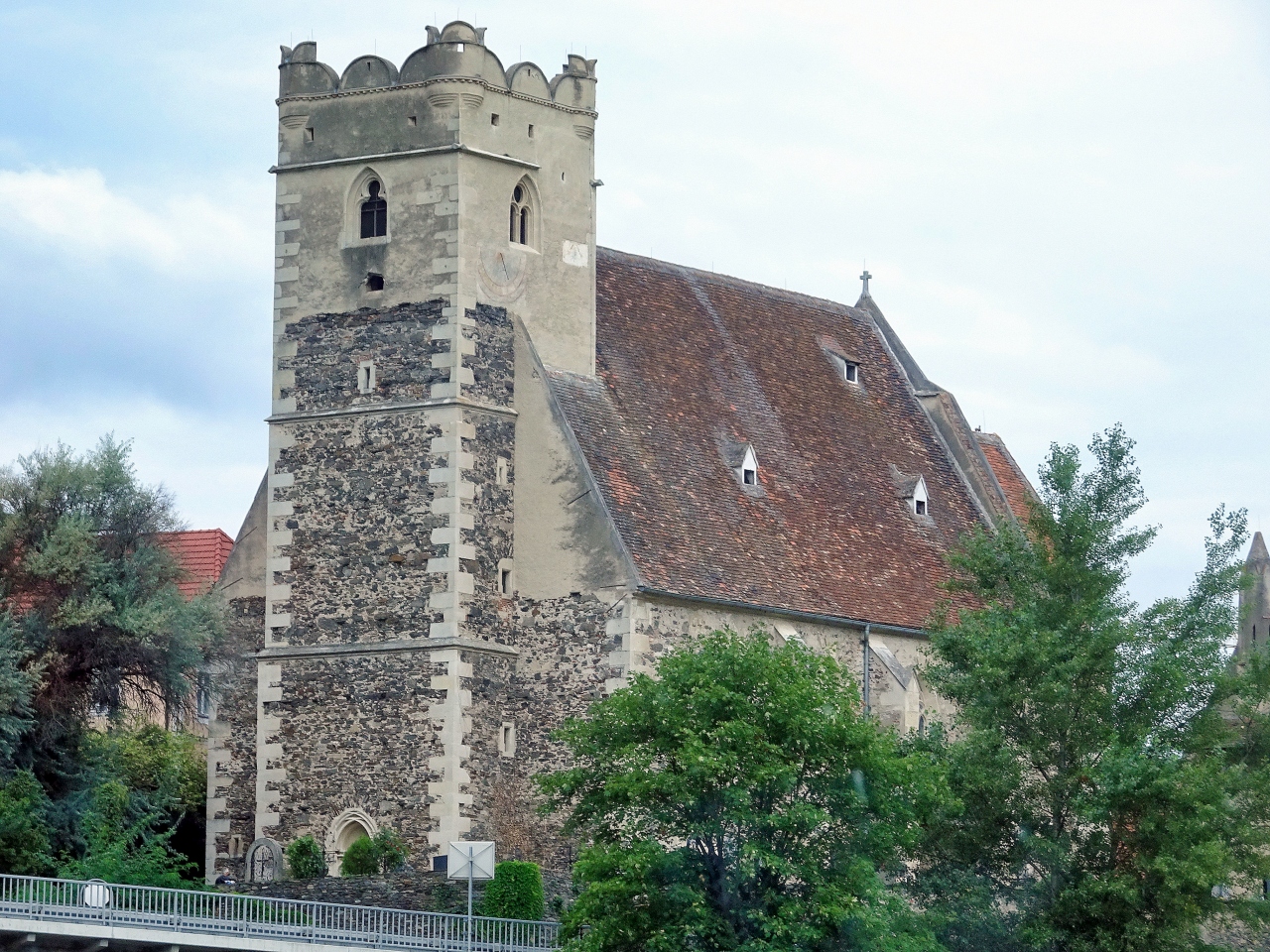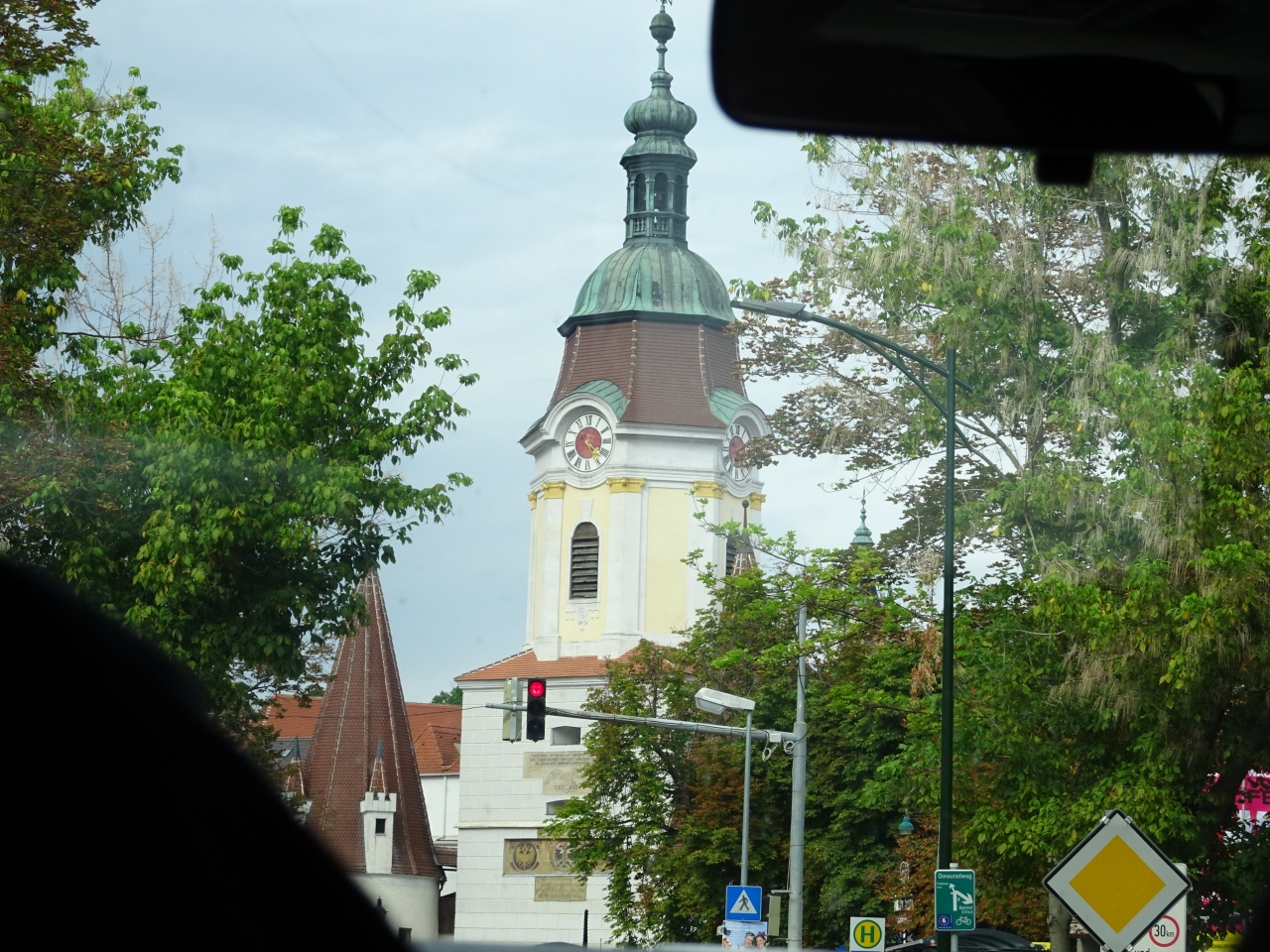 ヴァッハウ渓谷の終点クレムスの中心にある,この街のランドマークで,旧市街に4つあった門のうち唯一現存するもの。ヴァハウ渓谷への観光ツアーで車でデュルンシュタインからクレムス駅まで行く途中,車内から見ることができました。中央の塔には,ハプスブルク家のフリードリヒ3世が好んだモノグラム「A.E.I.O.U.」という文字が刻まれています。Alles Erdreich ist Osterreich untertanの略で,オーストリアは全世界の支配者であるというような意味のようです。そして,三つの紋章(クレムスの街の紋章,マリア・テレジア時代のハプスブルク帝国の紋章,1463年までの古い街の紋章)も見られます。