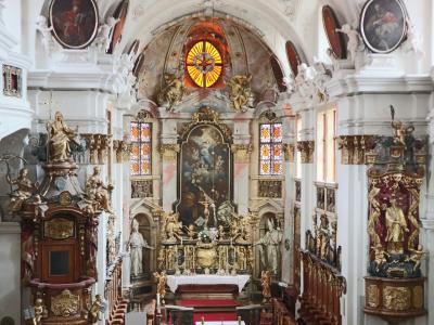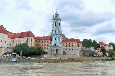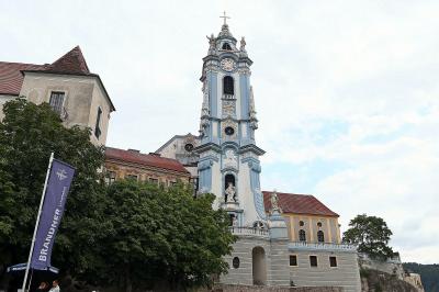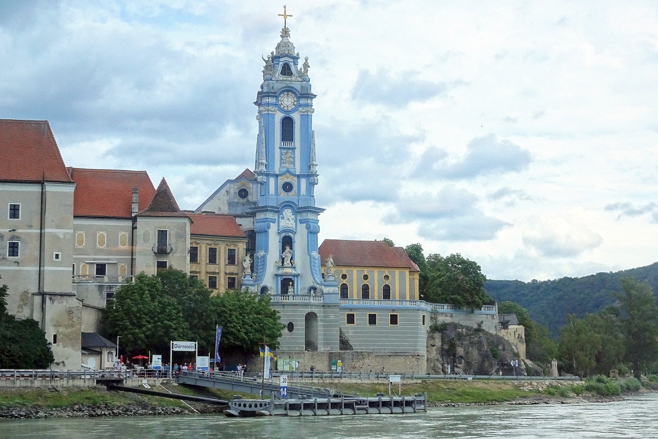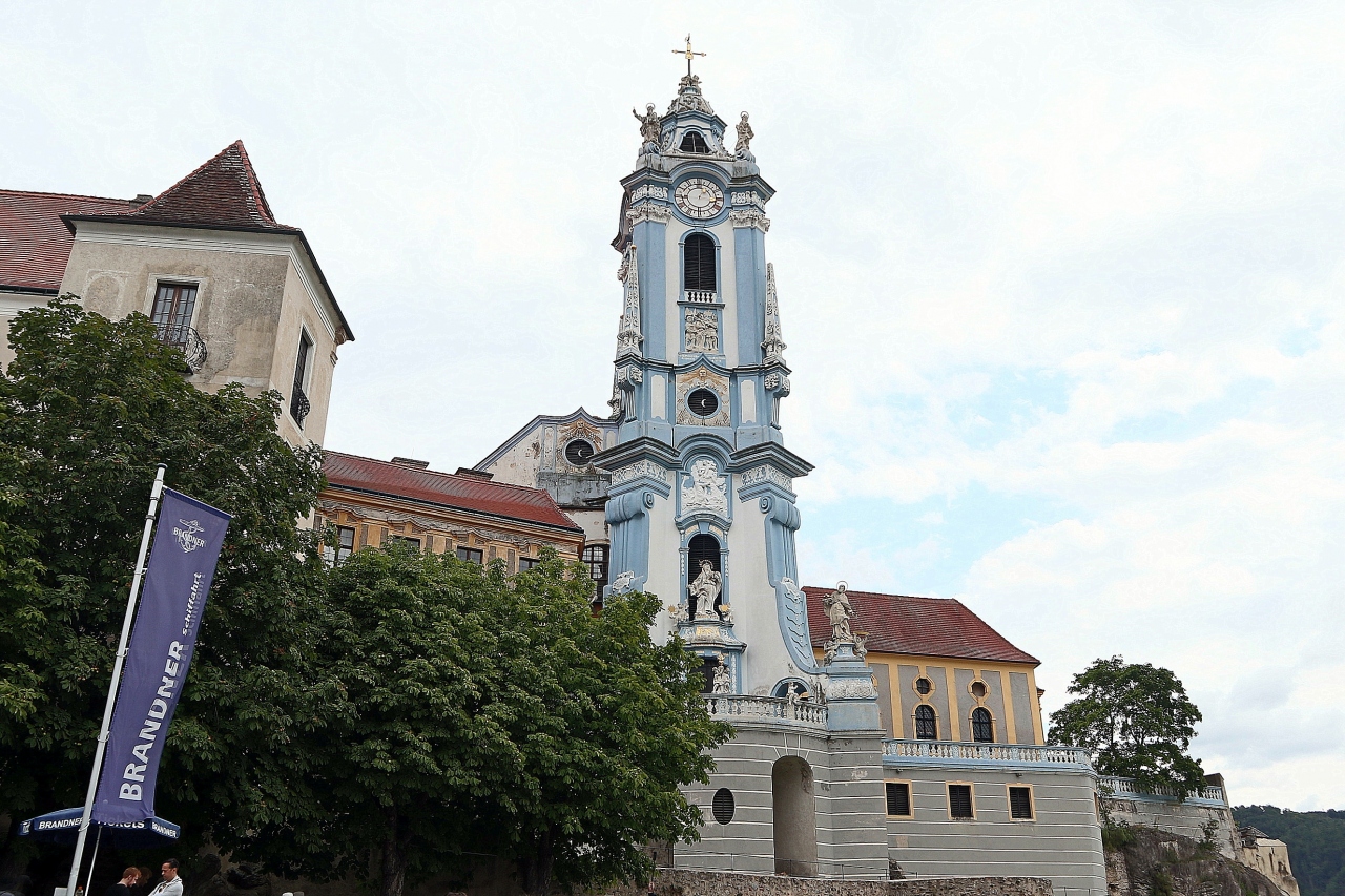 列車とクルーズで巡るヴァハウツアーで訪問。ドナウ川クルーズの船がデュルンシュタインに到着する直前から,この街のシンボルとなっている青色の艶やかな鐘楼が目に飛び込んできます。修道院へは船着き場の左側にあるトンネルを抜けて街のメインストリートであるハウプト通りを東へ進んだ中程から南へ通りを入って向かいます。拝観は有料で,拝観順路を示す見取り図とゲートを抜けるためのカードキーになっているチケットを受け取って入場。バロック調の装飾が素晴らしい身廊は,2階と1階の両方から見学できます。