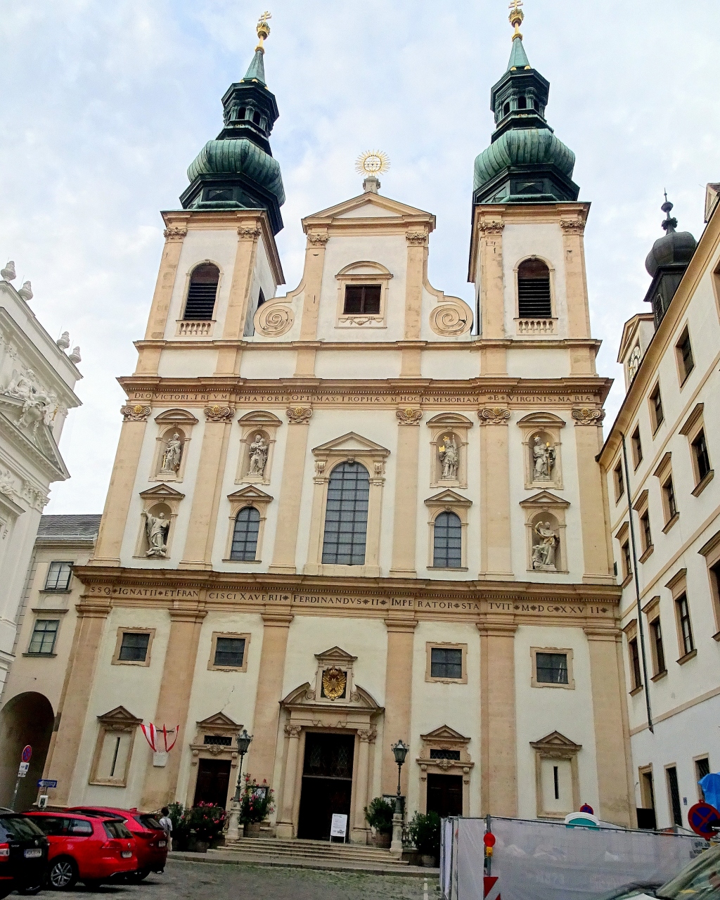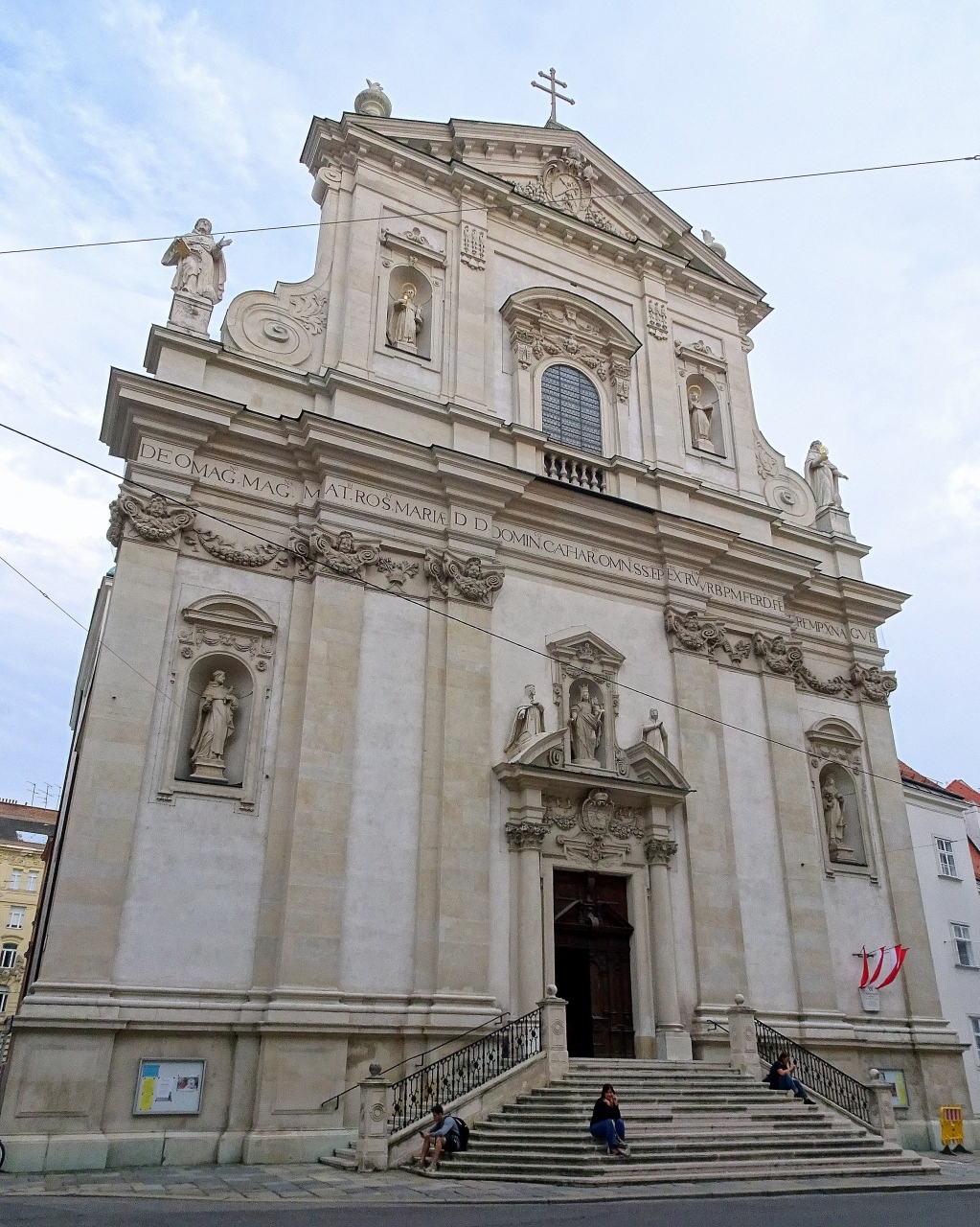 シュヴェーデンプラッツ駅からシュトゥーベントーアのレストランまでぶらぶら歩いて向かう道すがら,そのファサードが美しかったので,写真に収めました。1631年に皇帝フェルディナント2世により礎石が置かれ,1634年に献堂。その後1674年までに正面装飾やドームなどが作られたとか。代表的な初期バロック様式の教会で,教会の正面ファサードにはドミニコ会の聖人達が立っています。