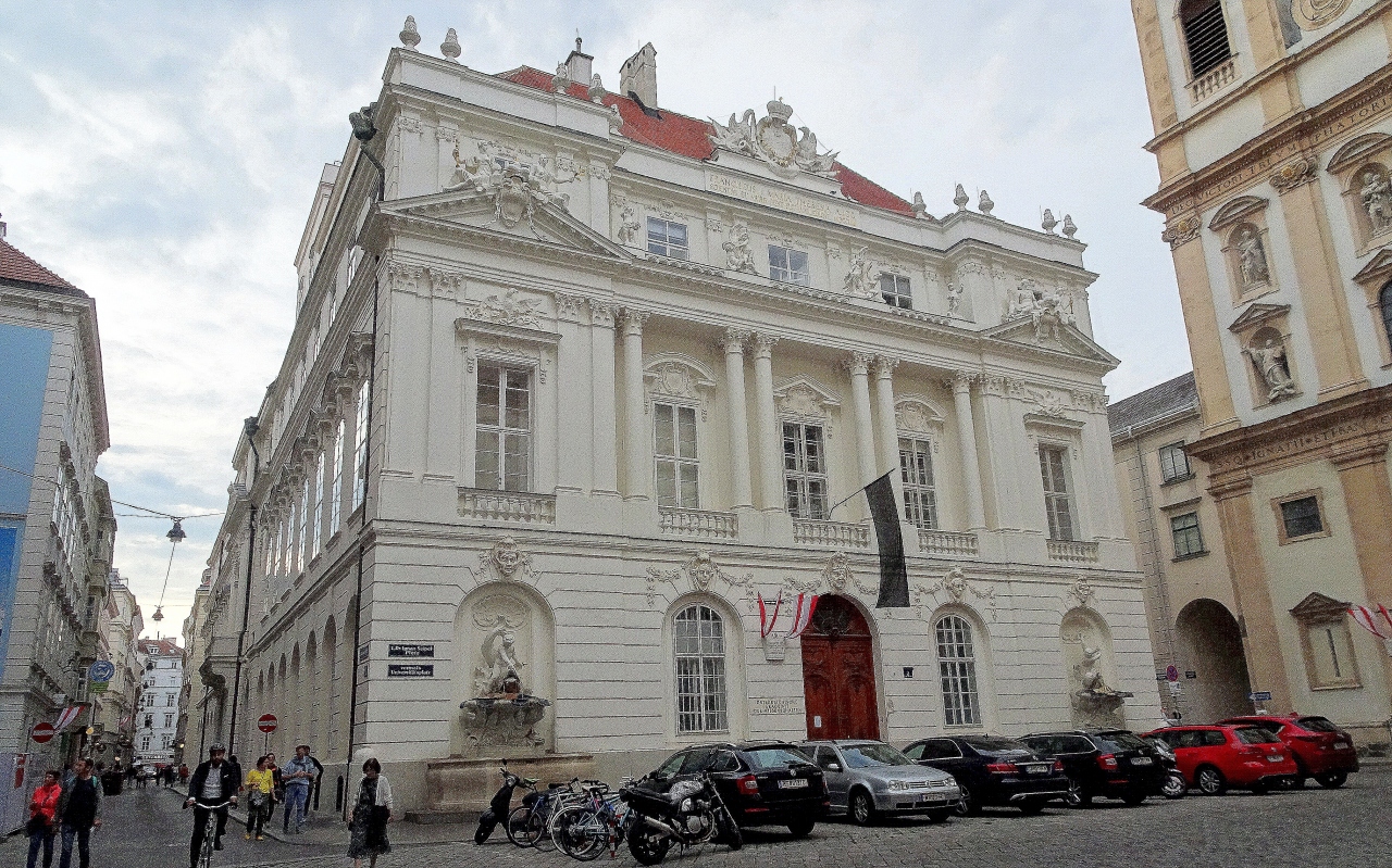 シュヴェーデンプラッツ駅からシュトゥーベントーアのレストランまでぶらぶら歩いて向かう道すがら,イエズス会教会とともにその立派な外観に惹かれて,写真に収めました。マリア・テレジアの時代1755年にフランスの建築家ジャン・ニコラス・ジャド・ド・ヴィル・イッセイによって建てられた旧ウィーン大学の講堂であった建物。上階には,フェストザールというロココ様式の祝祭の間があり,シェーンブルン宮殿の大広間の天井画を手掛けたグレゴリオ・ジュリエルミによる,医学・哲学・神学・法学の4つの学部を表した天井画が素晴らしいとのこと。