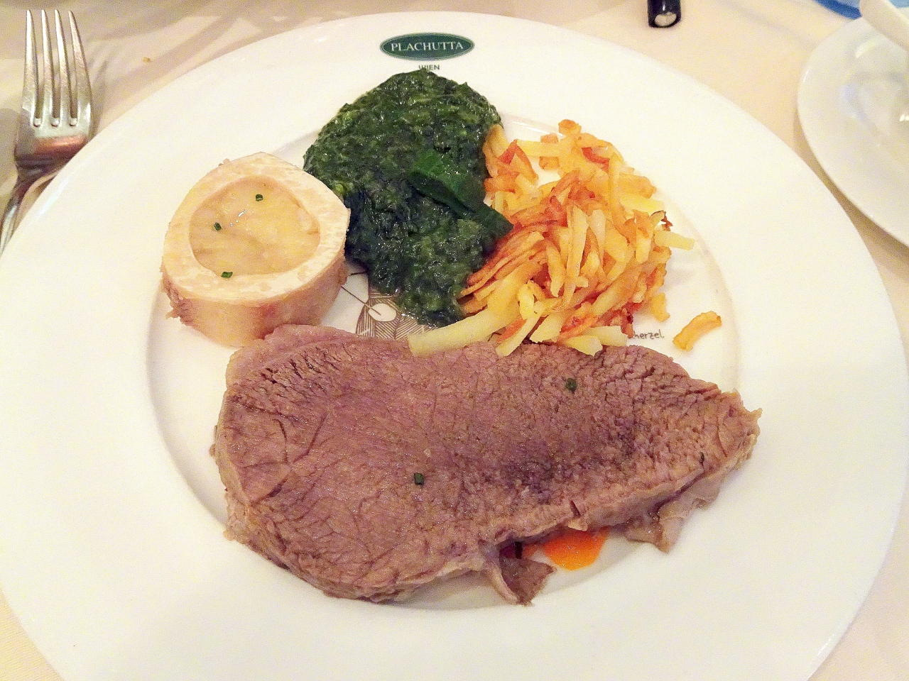1939年創業の老舗で,ヨーゼフ1世の好物だったというターフェルシュピッツの名店。オンライン予約してディナーに訪店。もちろんターフェルシュピッツを,2人用ポーションでオーダー。真鍮の鍋で供され,お店の方が取り分けてくれます。まずはスープから。牛肉の旨味がよく出ており,おかわり必至。本体の牛肉はゆうに一人スチーキ1枚半はあるボリュームですが,付け合わせ(ローストポテト,ホウレン草)やソース(ねぎの一種のチャイブのソース,すりおろしたリンゴと西洋ワサビを合わせたアプフェルクレン)を組み合わせて,食べ飽きることなく美味しくいただけました。ほかに黒パンが付いてきます。髄質のペーストを塗っていただくようになっていますが,これは好みが分かれるかもしれません。