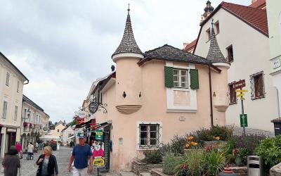 デュルンシュタイン唯一の目抜き通り。船着き場からトンネルの通路を上って向かいます。街の中央を東西に横断し,沿道には,市役所のほか,この地方特産のアプリコットを使ったジャムやお酒など見るだけでも楽しいおみやげ物屋や飲食店が並んでいます。
