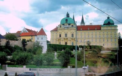 列車とクルーズで巡るヴァハウ渓谷への現地観光ツアーで,ウィーンへの帰り道,列車の車窓から,ウィーンの北部クロスターノイブルクの丘の上に見かけました。バーベンベルク家のレオポルド3世が,神聖ローマ皇帝(ザリエル朝)ハインリヒ4世の娘アグネスと結婚後,居城をメルクからクロスターノイブルクに移転し,1114年から1236年にロマネスク様式の修道院が建設された。レオポルド3世がその夫人アグネスとこの地に訪れた際,突風が夫人の被っていたベールを吹き飛ばし,ベールが見つかったら,その場所に修道院を建設するという誓いを立てたところ,8年後にニワトコの茂みの中に発見し,建設に至ったという不思議な経緯が「ベール伝説(Schleierlegende)」として語り継がれているという。オスマントルコの侵攻時に破壊されたが,カール6世の命でバロック様式に大改修された。