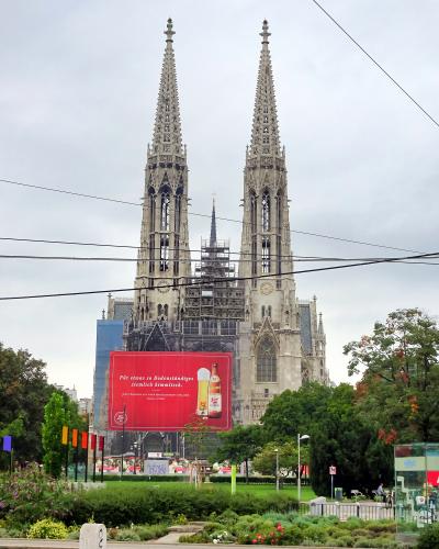 リング通りの北東外側。高さ99mの2本の塔を持つウィーンで2番目に大きな教会。1879年に完成したこの教会は,フランツ・ヨゼフ帝の暗殺計画が未遂に終わった事に感謝し,弟マキシミリアン3世がその事件現場に立てたものです。ウィーン大学を設計したハインリヒ・フォン・フェルステルが設計したネオ・ゴシック様式の美しい教会です。今回は残念ながら入場する時間がなく,ジークムントフロイト公園越しに外観を写真に収めただけですが,この教会の一番の見所は、色鮮やかなステンドグラス。色彩が鮮明で,絵柄もバラエティー豊かだそうです。