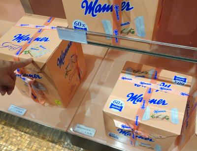 ウィーンといえばマンナーのウエハスといってもよいくらい定番のお菓子。前回訪れた際も買い求めましたが,なかなかチョコレートをおみやげにしにくい夏場の季節にちょうどよい品物です。こちらのお店は販売面積こそ広くないものの,シュテファン大聖堂の裏というアクセスの良さから訪店。お配り用のものや詰め合わせなど,選ぶことができました。因みに,このお店は日曜日や休日も開いているとのことです。