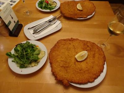 お皿からはみ出る巨大シュ二ッツェルが有名で,ガイドブックに必ず取り上げられているお店の2号店。本店の予約が取れなかったので,このお店に。シュテファン寺院から,本店の前を経由して訪店しました。豚肉を使ったオリジナルのシュ二ッツェルをミニサラダとともにオーダー。レモンをかけただけのシンプルな味付けですが,衣がサクサクで,ワインにも合い,美味しくいただきました。さすが一人で一枚食べるのは難しく,3分の1強位残してしまいました。二人でー皿をシェアするのでも十分だったかもしれないです。サラダは甘めのドレッシングがいい感じで,ポテトサラダにはパンプキンオイルが垂らしてありました。