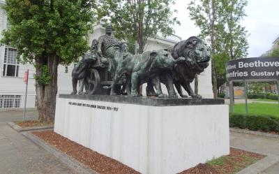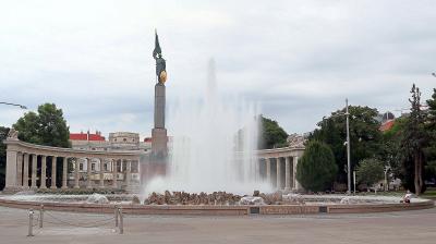 ウィーンで宿泊したアム・コンツェルトハウスから近く,トラムの停留所にもなっており,何度か傍を通りました。シュヴァルツェンベルク宮殿の前の広場で,周囲の道路から緩やかに高くなっています。中央には,1873年10月に完成したホッホシュトラールブルネン(噴水)が配置され,その奥(宮殿との間)に,ソビエト戦勝記念碑があり,噴水の水柱と記念碑の兵士像が並び立つような感じで見えます。広場の北西には,黄金のエンブレムのような彫像が印象的なフランス大使館の建物があります。