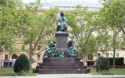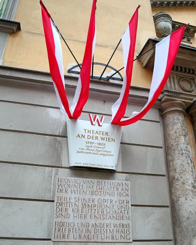 『魔笛』の台本作者シカネーダーが1801年に開設したウィーンに現存する最古のオペラ劇場。劇場の北側のミレッカー通りには,開設当時の正門である「パパゲーノ門」が当時の面影を残しています。NHKの 名曲アルバムの『歌劇”魔笛“序曲』のバック映像として流れたのが印象に残っていたことから,今回行って見てみることにしました。残念ながらミレッカー通りの修復工事のためのトラックが前を陣取っていてうまい具合には写真に収めることはできませんでしたが,門の上にパパゲーノ役を演じるシカネーダーと3人の息子たちの像を見ることができました。また,ベートーヴェンが音楽監督として招聘され,1803~04年ここに住んでいたということで,壁に銘板があります。交響曲第3,5,6番のほか,オペラ『フィデリオ』もこの劇場で初演されたようです。