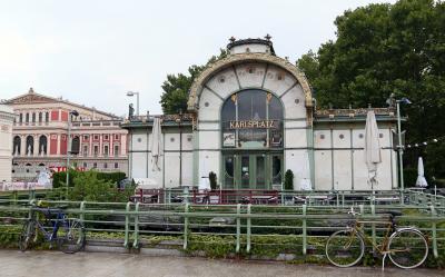 向かい合う2棟一対の駅舎で,オットー・ヴァーグナーによるユーゲントシュティール建築の代表作。19世紀末に生まれた新しい芸術の潮流で,アール・ヌーヴォーとも言われます。屋根の庇や壁面に施された黄金の装飾が特徴的。前身であるSバーンが地下鉄U4線に転換されて廃業。博物館とカフェに転用されていますが,博物館の方の建物には,心ない落書きがなされ,景観が台無し。