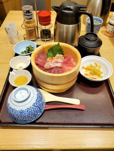 サウスゲートビル16階のレストラン街のおひつ御飯のお店。今回は,まぐろ三昧(まぐろ,びんちょうまぐろ,まぐろたたたき)のおひつ御飯小鉢付きをいただきました。わさび醤油で食べることもできますが,オリジナルなのがゆず風味の塩だれ。新感覚で結構いけました。最後は,出汁をかけて,出汁茶漬風に食べる締めもグッドでした。