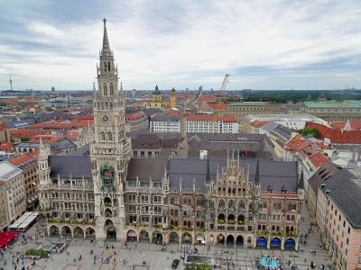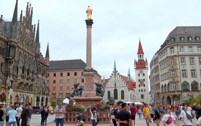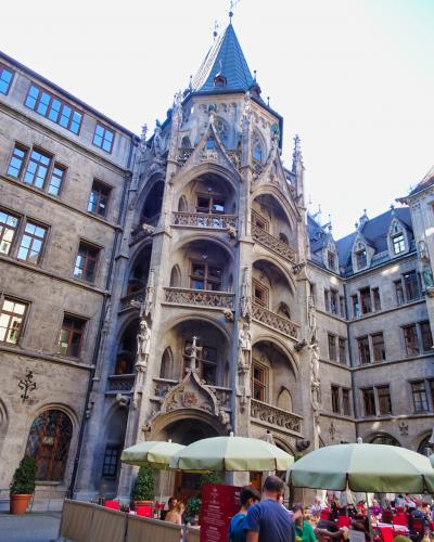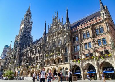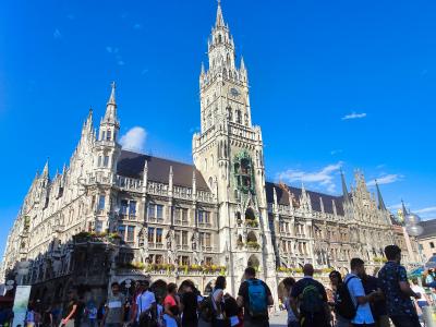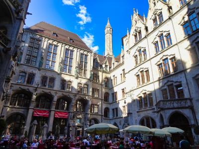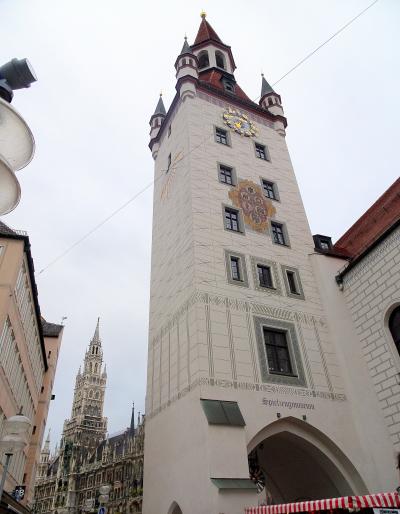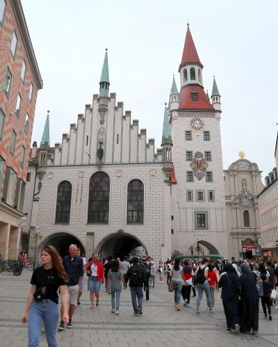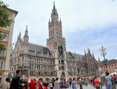 ミュンヘン観光の中心スポットで,常に観光客で溢れています。特に,グロッケンシュピールの仕掛けが動く時間には,カメラやビデオを片手に大勢の人が集まります。撮影に気を取られている人を狙うスリに用心です。この広場では,グロッケンシュピールのほかにも好被写体は多く,なんといってもネオゴシックの新市庁舎は全景を収めたいところですが,建物から十分な距離がとれず,また,観光客の往来があって,なかなか塔の先まで入れることが難しかったです。建物の左右では,比較的右側からの方が角度的に撮りやすかったです。