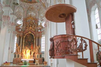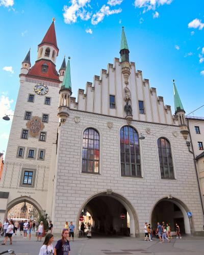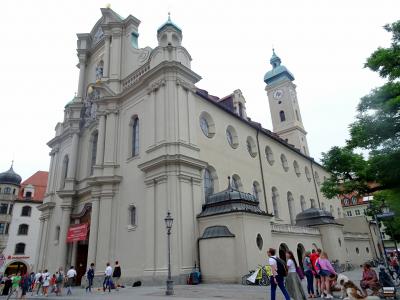 マリエン広場の東,旧市庁舎のアーチをくぐってすぐのところにある教会。1208年に創建されたミュンヘンでも最も古い教会の一つらしいです。現在の建物は戦後に再建されたものですが,18世紀にアザム兄弟によって加えられたバロック様式のフレスコ画や漆喰装飾が見事。白い柱とピンクの装飾がよくマッチしたとても美しい身廊で,アザム兄弟による天井画は必見です。82mの塔は展望台に昇ることができるようです。