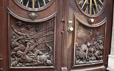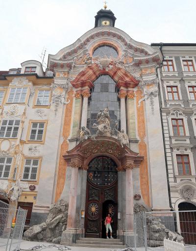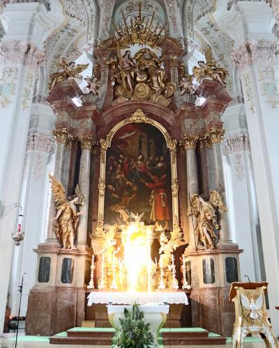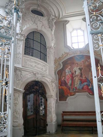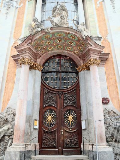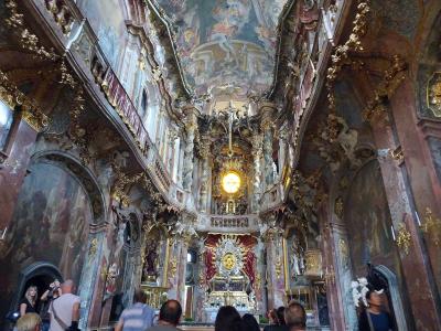 1733~46年に芸術家で建築家のアザム兄弟が私財を投げうって家の敷地内に建てた教会。ゼントリンガー通りの中ほど,非常に狭い間口ですが,入ロの扉や屋根も凝っていて存在感があります。教会の正式名は,聖ヨハン・ネポムク教会といい,正面扉の上に聖ヨハン・ネポムクの像が立っています。8×22平方メートルという狭い敷地に建てられただけあって,中は非常にこじんまり。その中に様々な装飾が施され,とても教会とは思えない色使いの世界が展開されています。照明が少なく薄暗いため,その芸術性がわかりにくいのがやや残念に思いました。