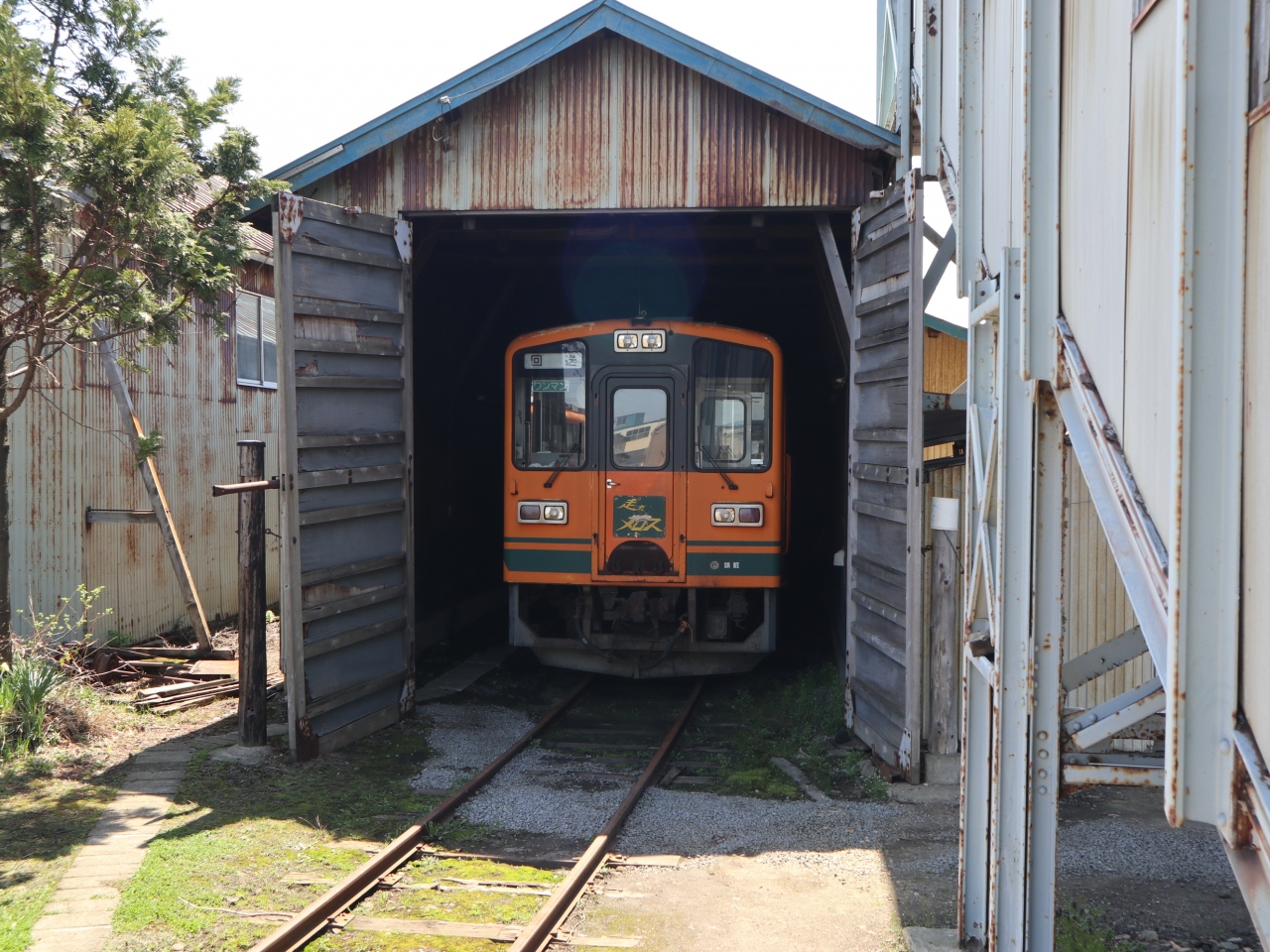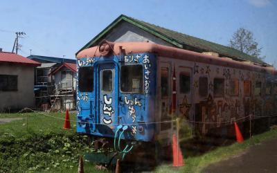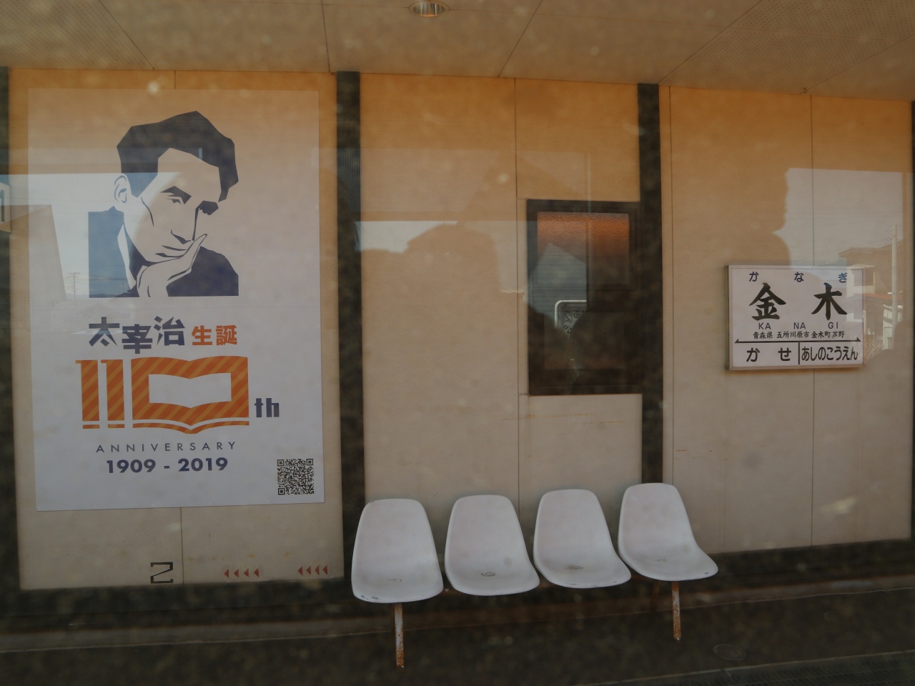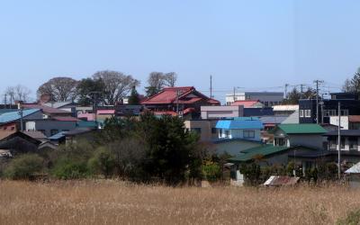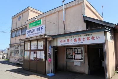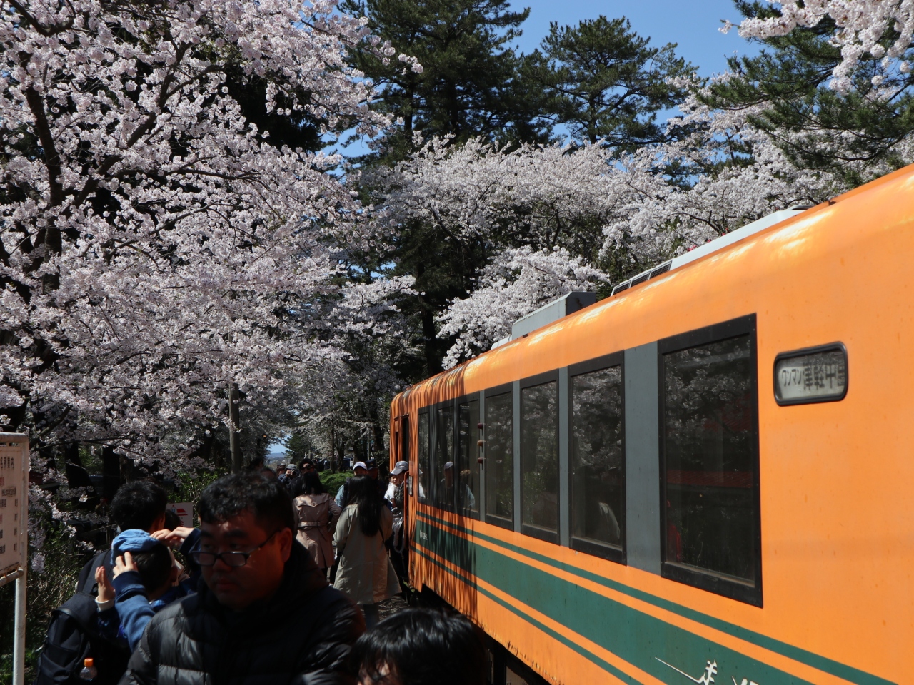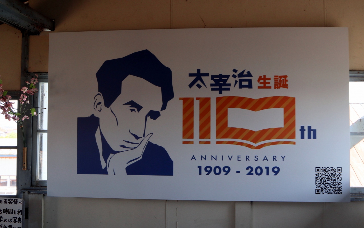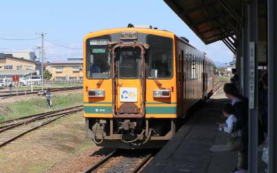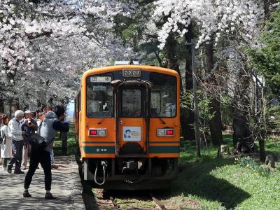 観光ツアーで,五所川原から芦野公園まで乗車しました。地元出身の太宰治の作品「走れメロス」の愛称が付けられたオレンジ色に緑のラインの車両で,今年は太宰治の生誕110年を記念したプレートも付けられていました。2両編成で,団体予約客と一般利用客とで車両を分けているようでした。乗車中は,津軽半島観光アテンダントさんが津軽弁で沿線のガイドをしてくれました。住宅街を抜けると,黄色い菜の花が並ぶ田園風景が続き,金木駅の手前では,左側の向こうに,太宰治の生家「斜陽館」の赤い屋根が見え,到着した芦野公園駅の両サイドには満開となった桜が出迎えてくれました。