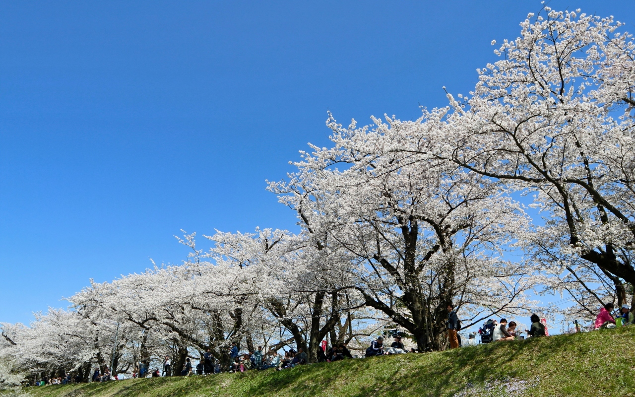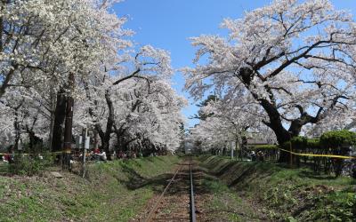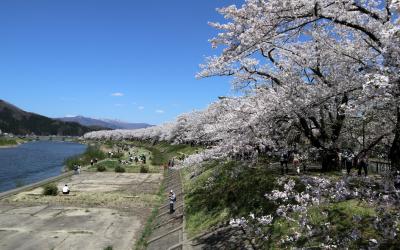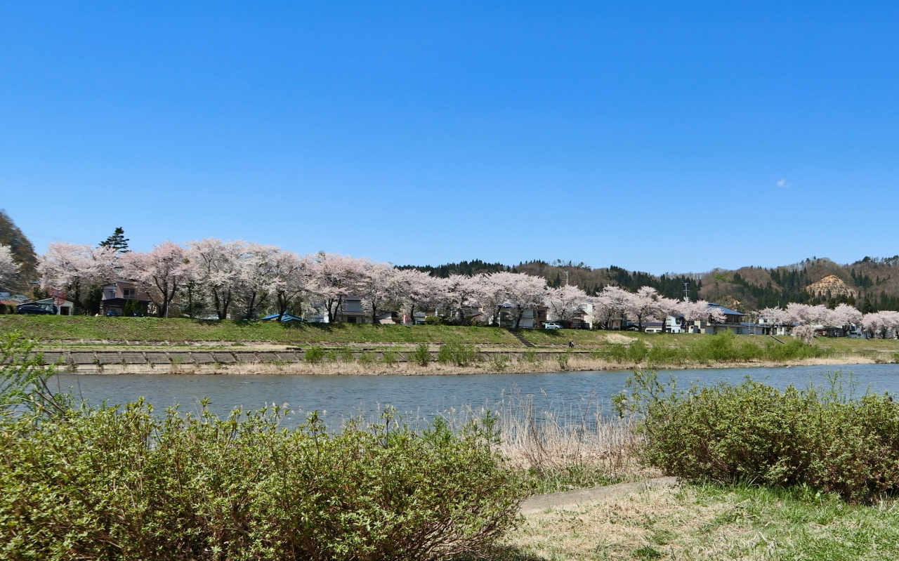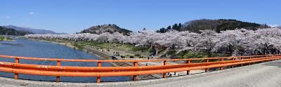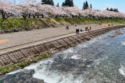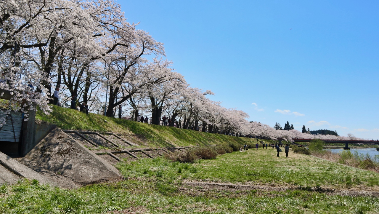 ゴールデンウイークの10連休に,「みちのく三大桜名所」を巡る観光バスツアーで訪問しました。駐車場からすぐ,全長2㎞にわたるソメイヨシノ並木がピンクのトンネルとなっていました。この日は好天にも恵まれ,緑の河原にレジャーシートを広げて,お弁当を食べながら花見する人も大勢いました。河原から見上げるようにすると,青空に映える桜並木がとても美しかったです。朱色のガードレールがいまいちですが,横町橋からの桜並木や古城山の眺めもなかなかです。横町橋の少し上流側に河原に張り出した展望スポットがあり,そこからは堤と同じ高さで,向こうまで続く桜並木を一望できます。