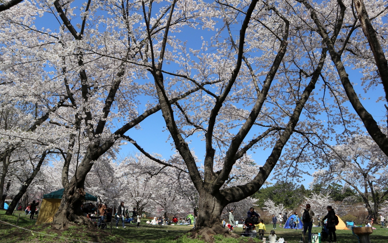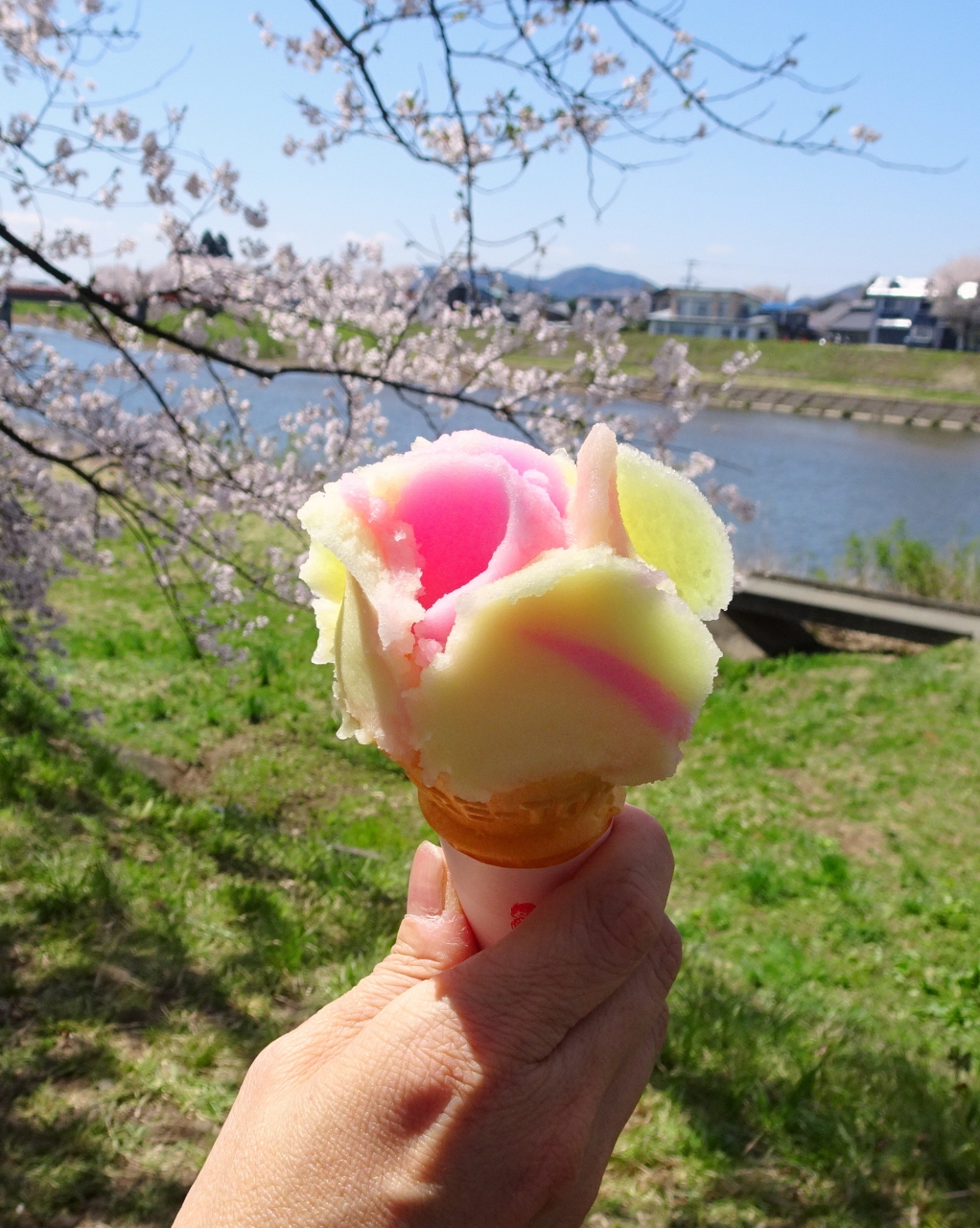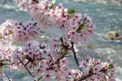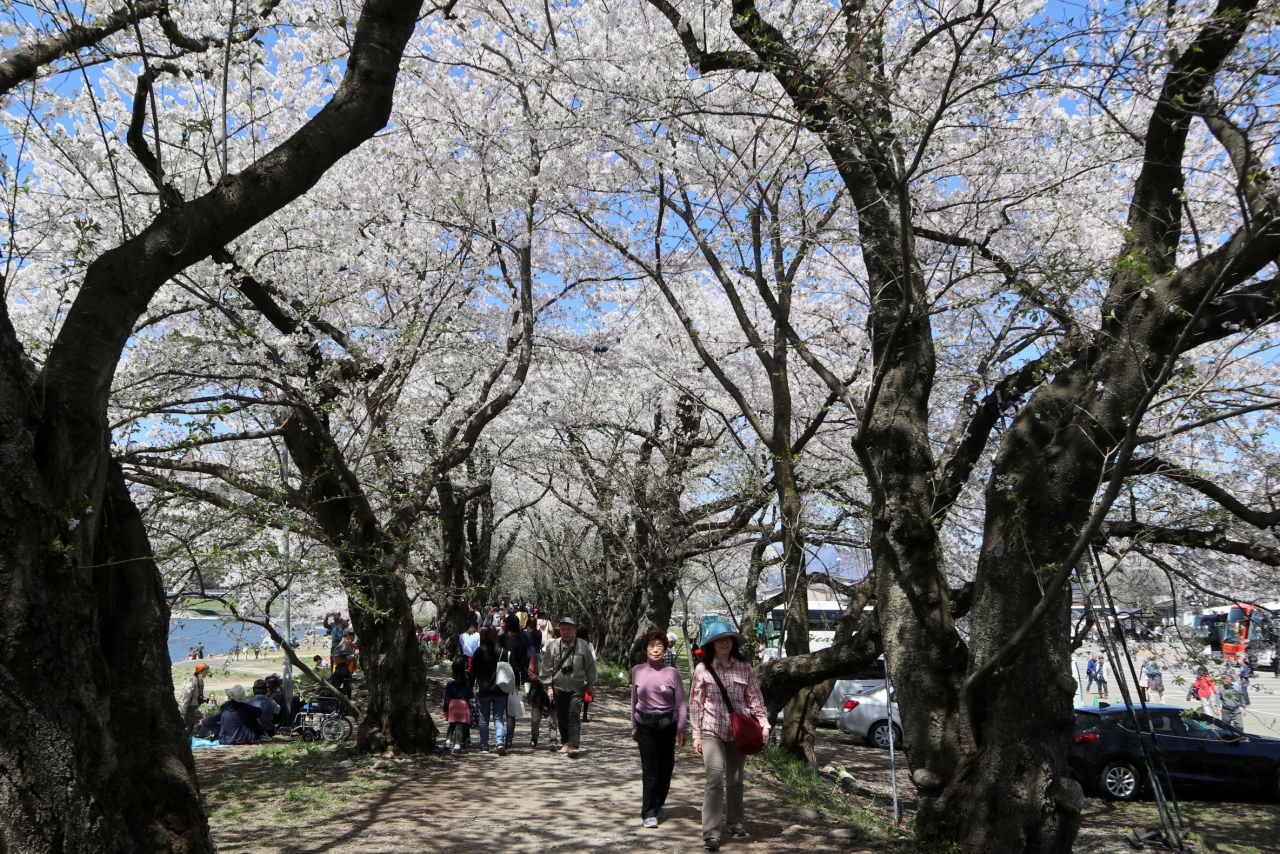 ゴールデンウイークの10連休に,「みちのく三大桜名所」を巡る観光バスツアーで訪問しました。駐車場からすぐ,全長2㎞にわたるソメイヨシノ並木がピンクのトンネルとなっていました。この日は好天にも恵まれ,緑の河原にレジャーシートを広げて,お弁当を食べながら花見する人も大勢いました。河原から見上げるようにすると,青空に映える桜並木がとても美しかったです。朱色のガードレールがいまいちですが,横町橋からの桜並木や古城山の眺めもなかなかです。横町橋の少し上流側に河原に張り出した展望スポットがあり,そこからは堤と同じ高さで,向こうまで続く桜並木を一望できます。