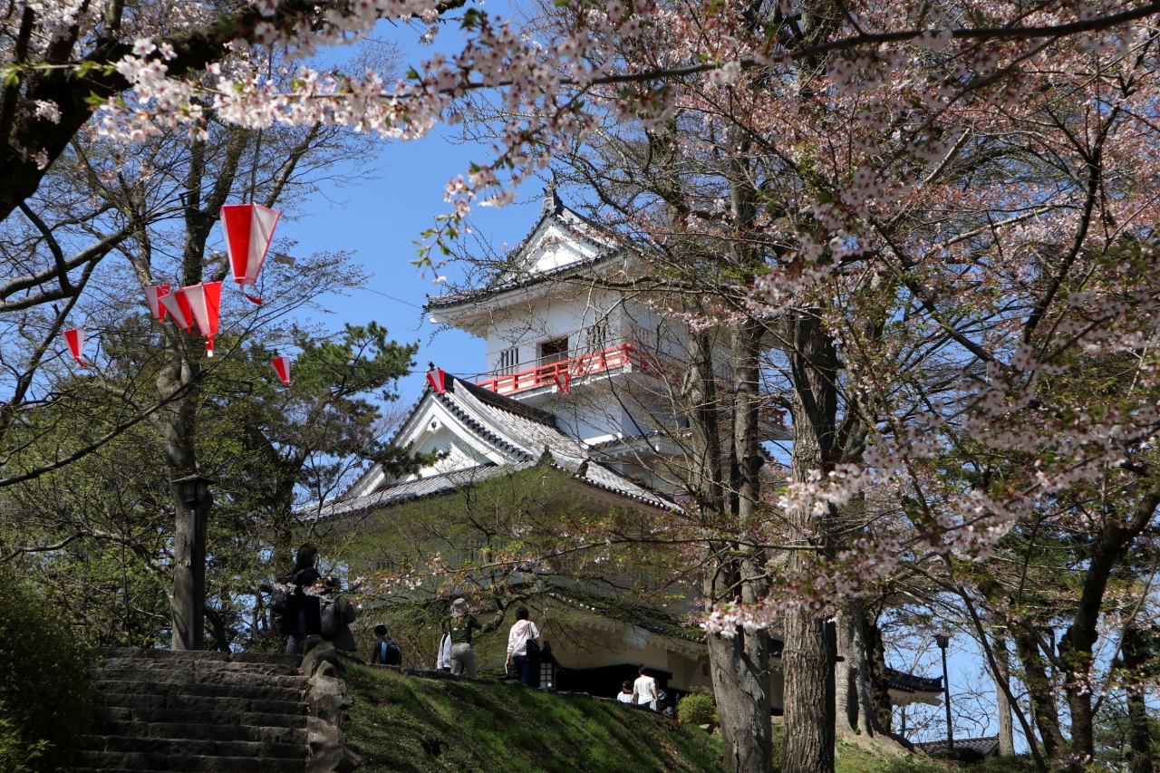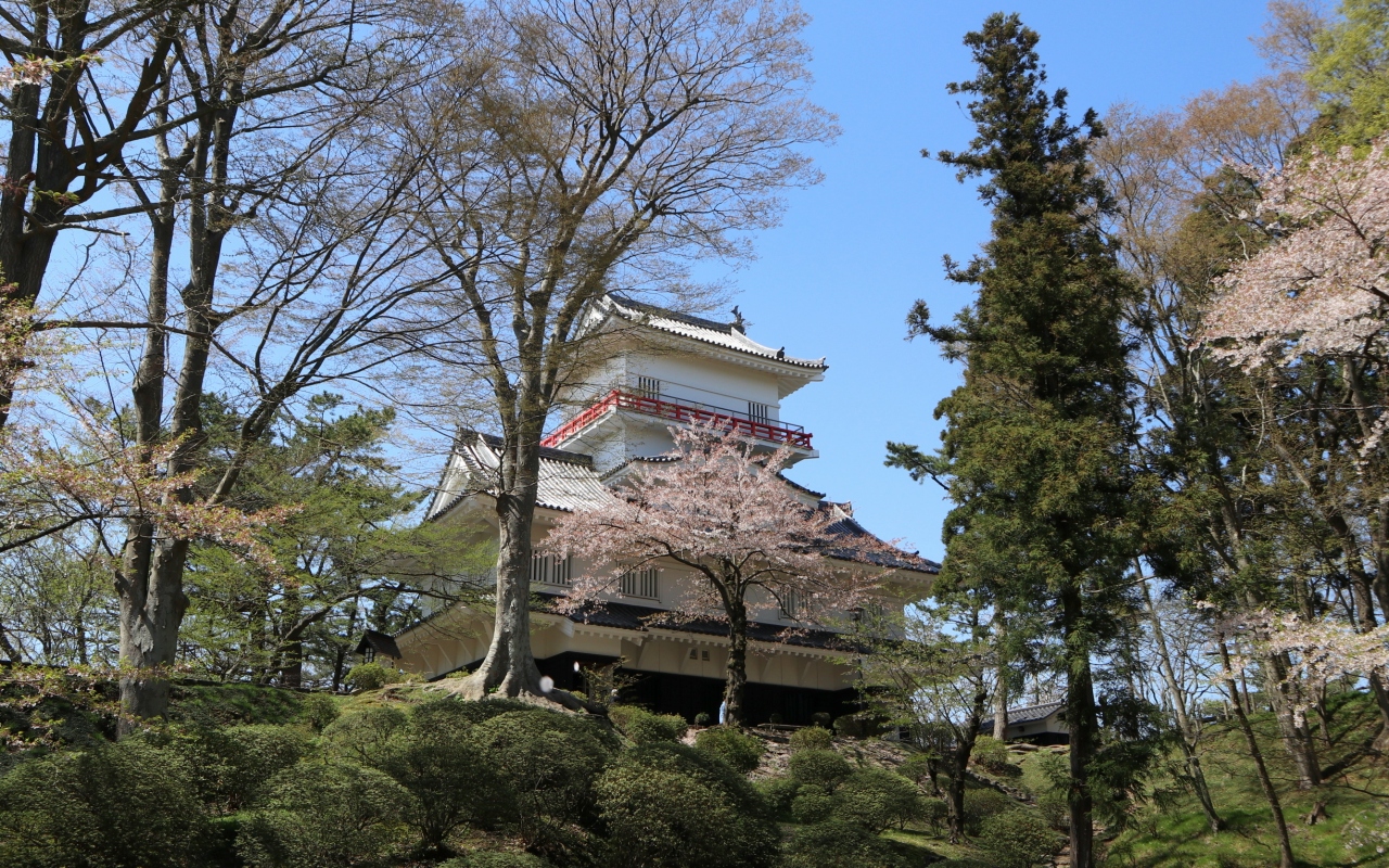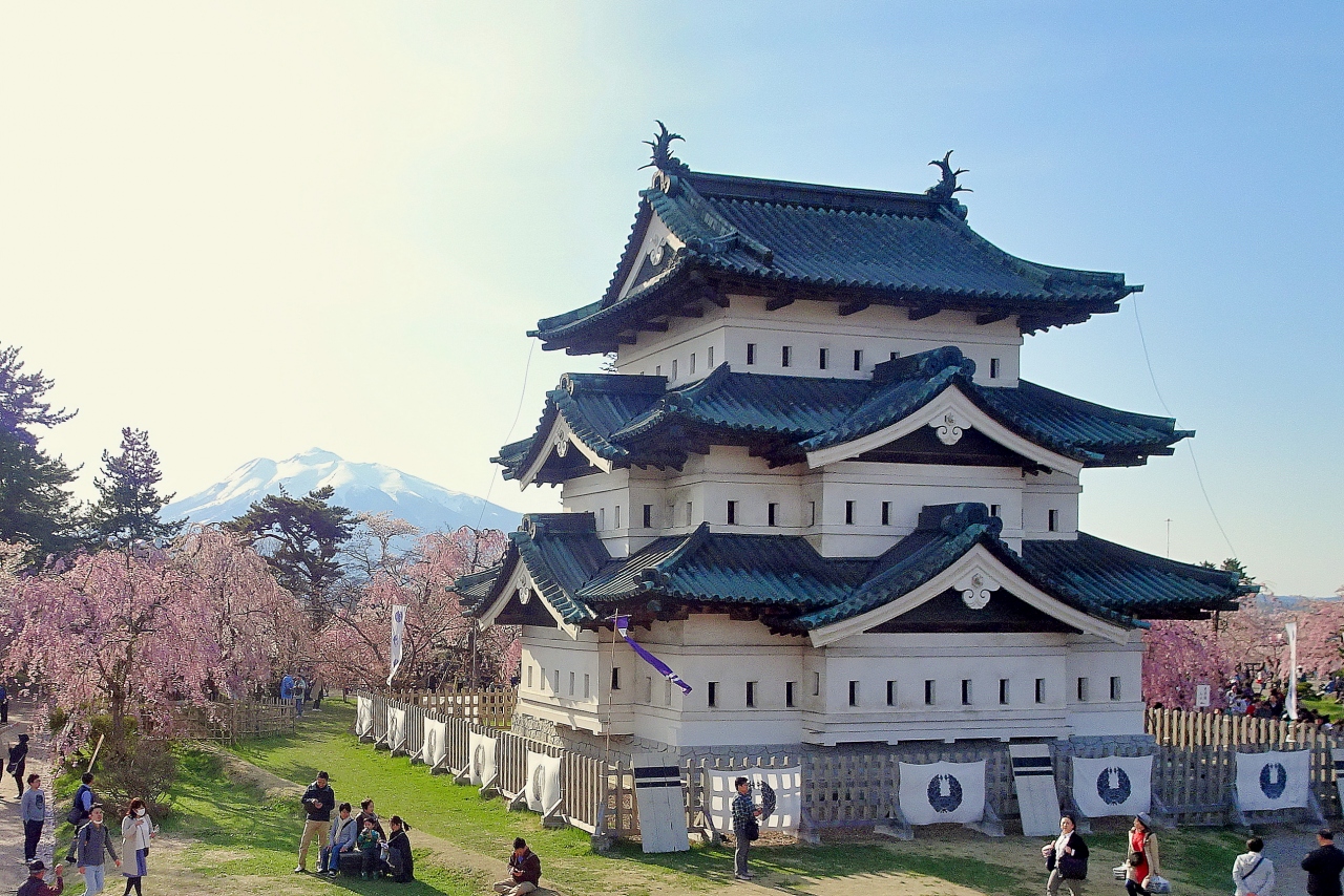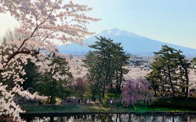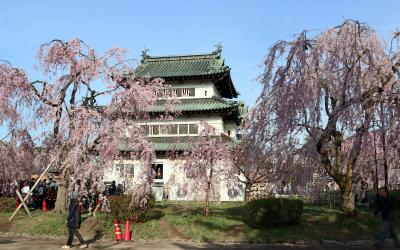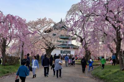 ゴールデンウイークの10連休に,「みちのく三大桜名所」を巡る観光バスツアーで訪問。お城に至る道路が大渋滞。石垣の修理のため曳屋によって天守が移動されたため,石垣と天守と桜という定番の写真は撮れなくなりましたが,城見台に登って,桜と天守と岩木山が一望できるようになりました。ただ,午後は逆光になるので,岩木山まで綺麗に撮るなら午前がいいでしょう。天守の周りはしだれ桜が多く,濃いピンクとお城がよくマッチ。