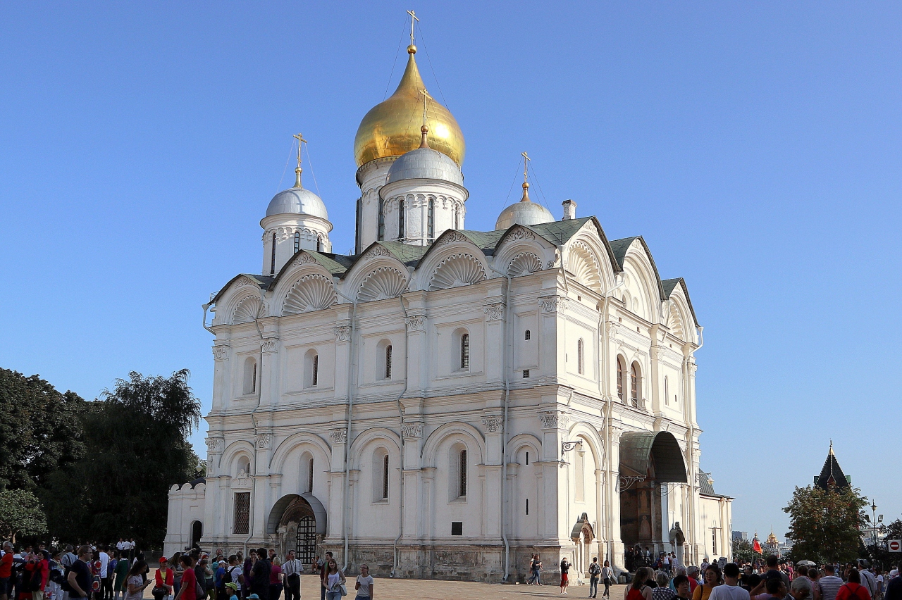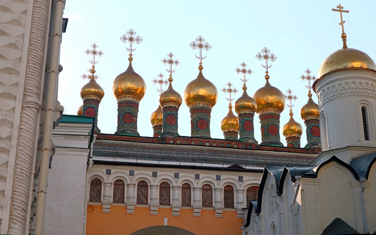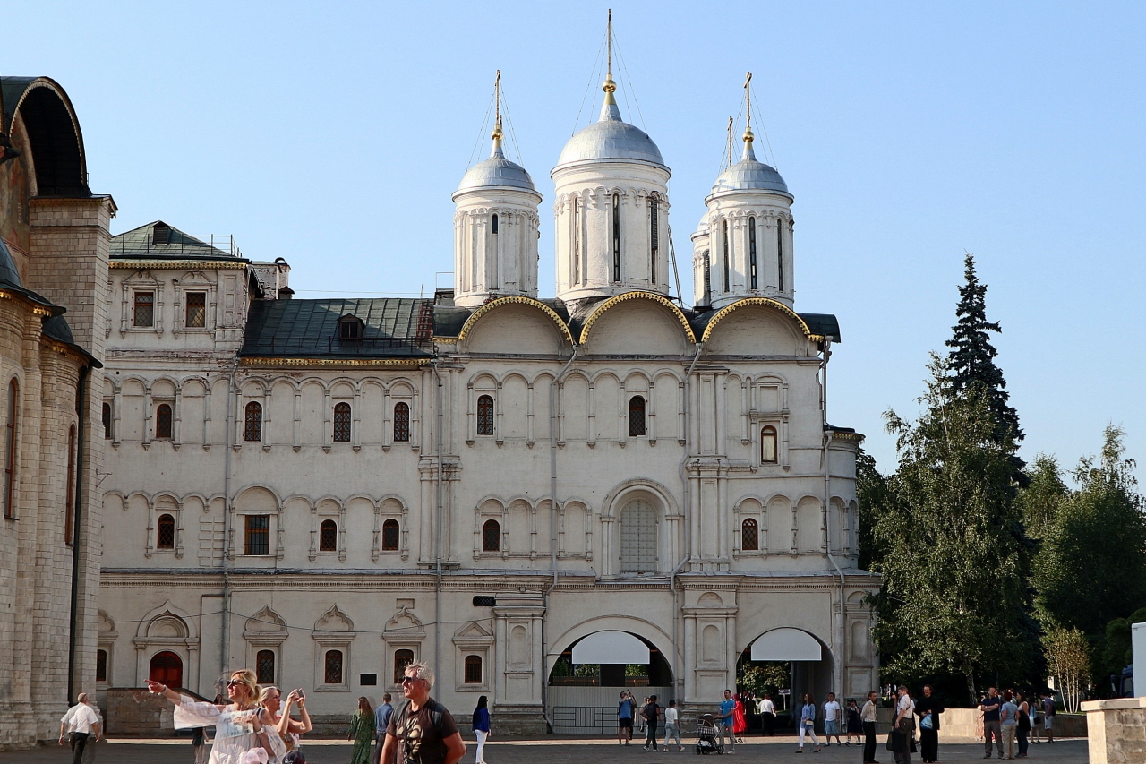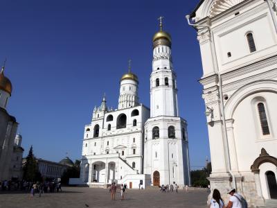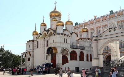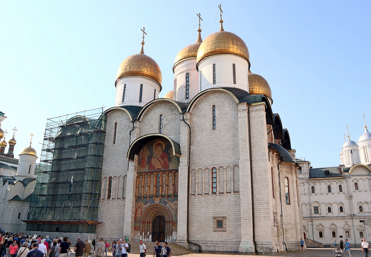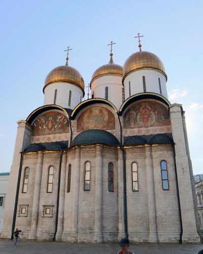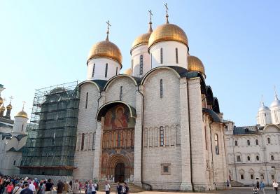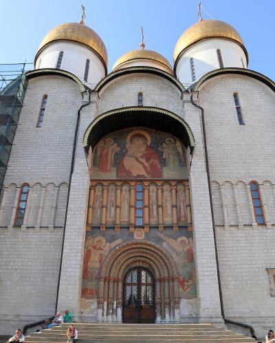 ツアーで入場観光。ロシア正教の総主教会で,歴代皇帝の戴冠式もここで行われていた。内部の写真撮影は不可。改修のため一部覆いがありましたが,何列もある高いイコノスタス,外壁や内部の壁面,柱の全面に施されたフレスコ画が素晴らしい。見どころなど入口に置かれたリーフレットに詳しい解説が掲載されています(残念ながら日本語版はありません。)。