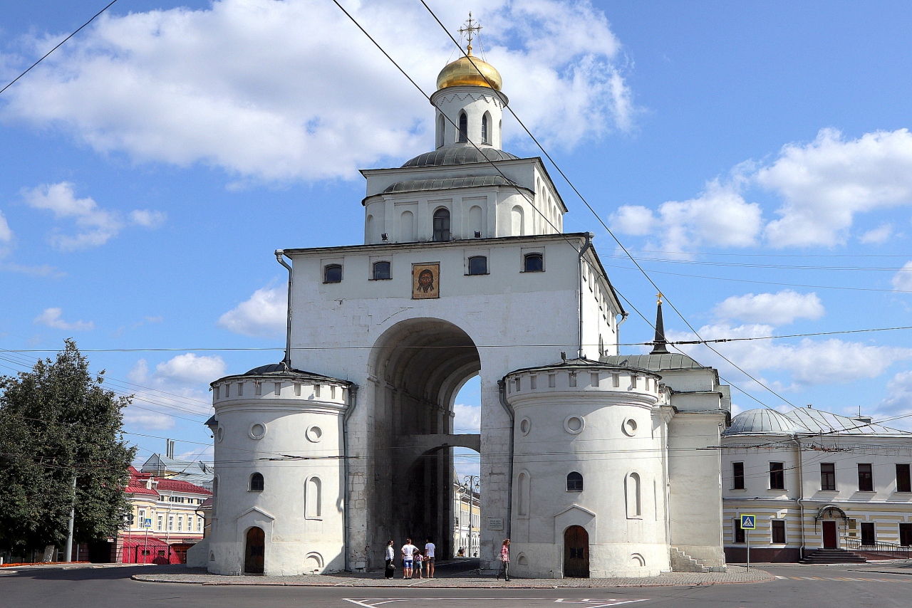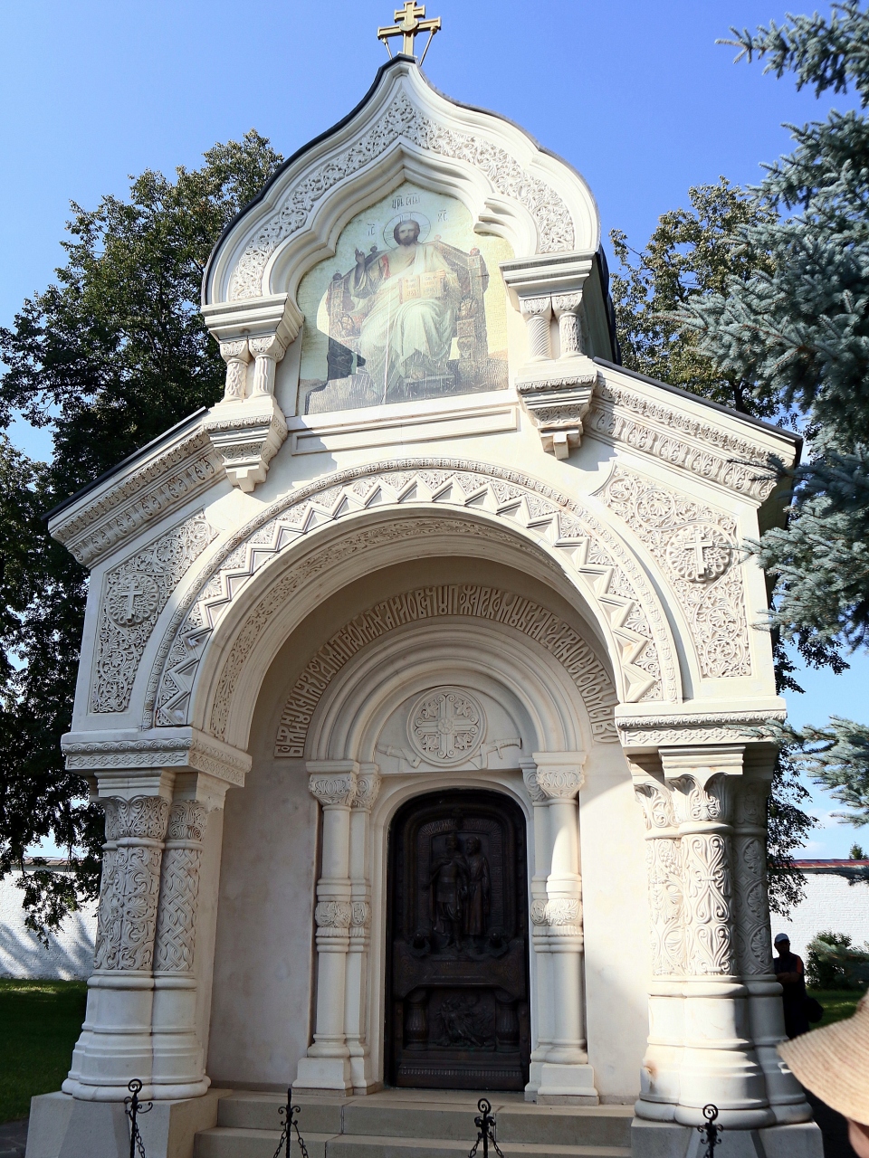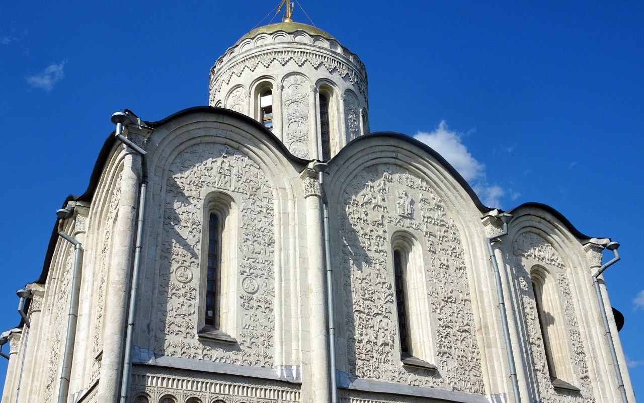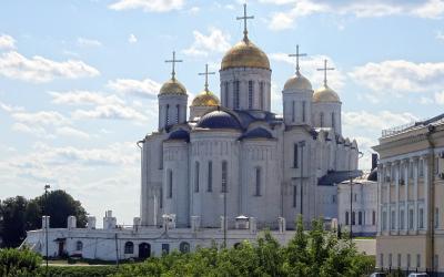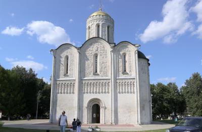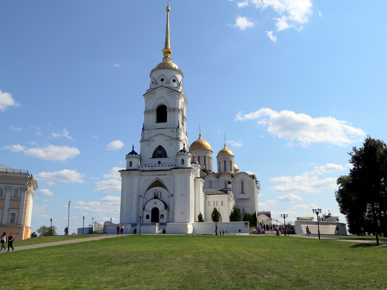ツアーで下車観光。長くロシアの教会の中で最大の規模を誇り,ロシア各地の同名寺院の手本となったとのことで,確かに北側の鐘楼を除けば,モスクワのウスペンスキー大聖堂に似た外観ですね。聖堂広場側の芝生広場からの写真撮影はどうしても逆光になってしまいます。