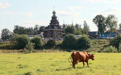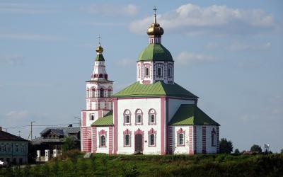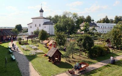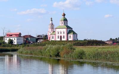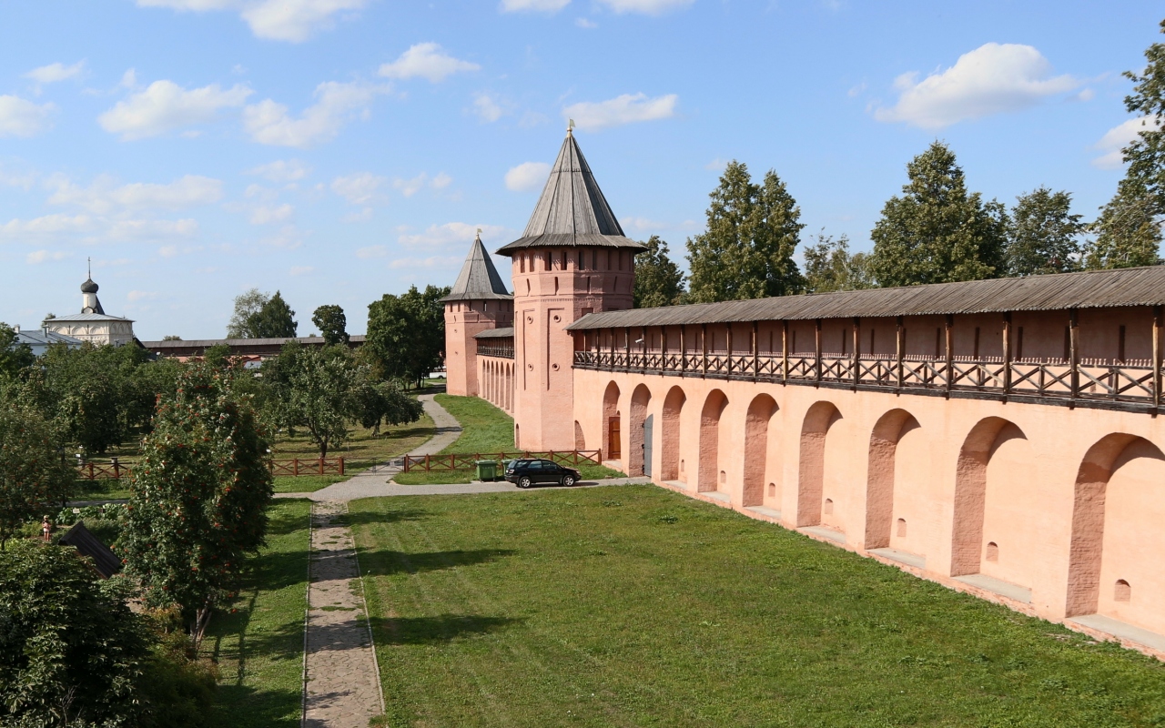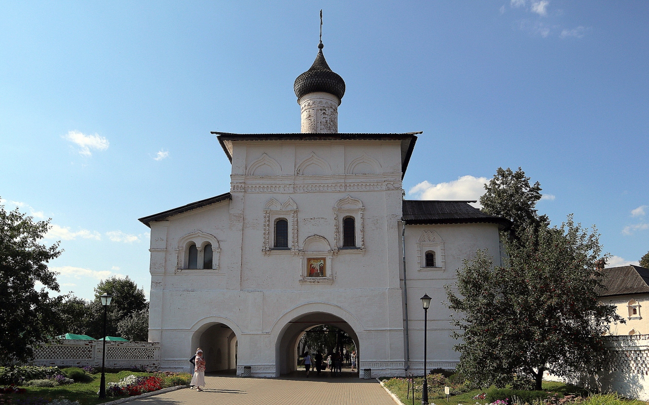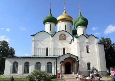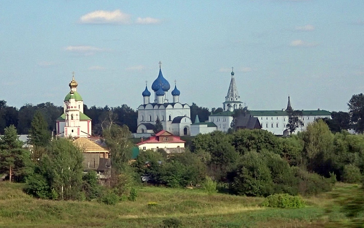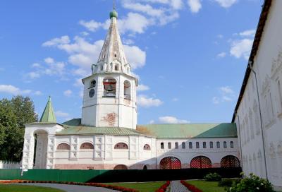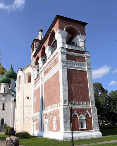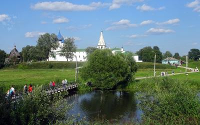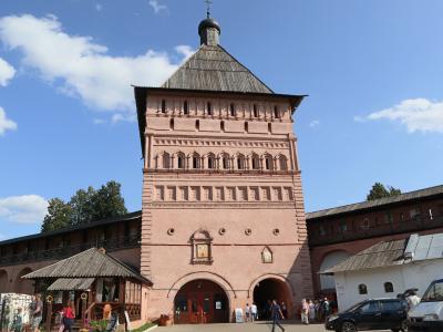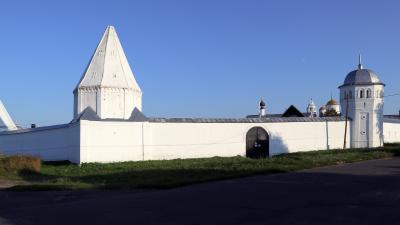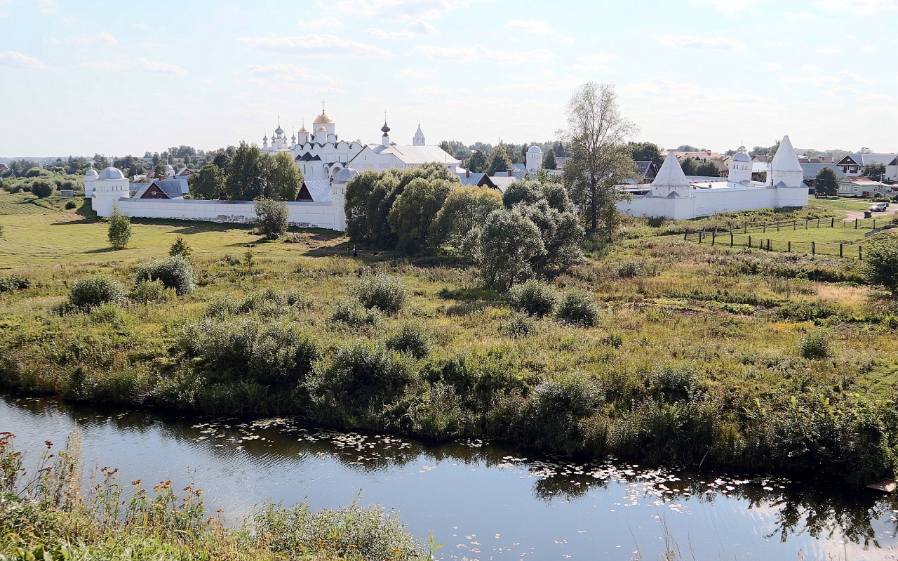 スパソ・エフフィミエフ修道院の脇の展望台からカメンカ川を望んだ際,正面に見えた白壁に囲まれた修道院。1364年に創設されたもので,ピョートル1世の最初の妻エヴドキヤ・ロプーヒナもここで暮らしていたという。宿泊したスズダリ・ホテルからも徒歩で行くことができました。