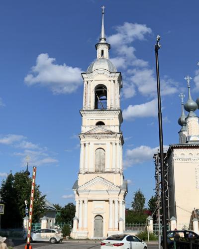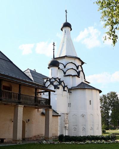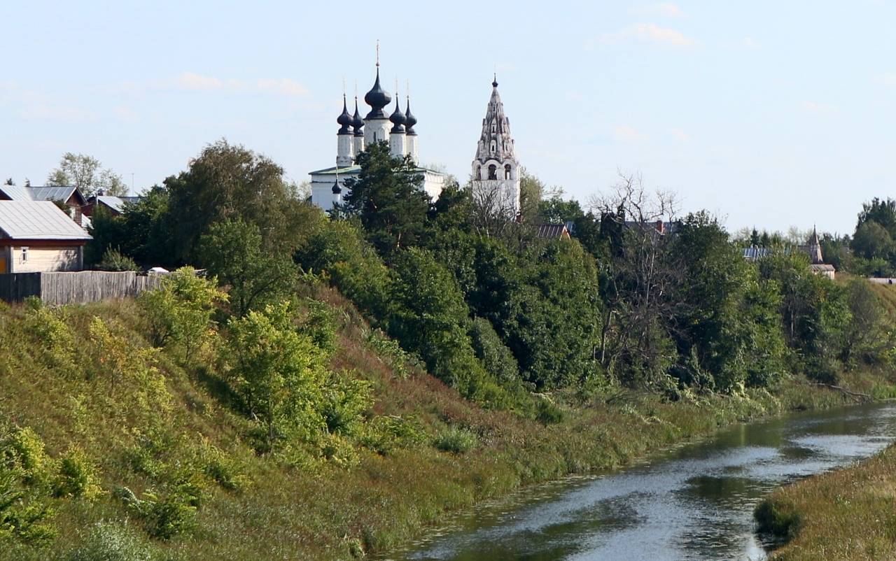 スパソ・エフフィミエフ修道院の脇の展望台からカメンカ川を望んだ際,左側に見えました。カメンカ川畔の高台に立つ,1240年にアレクサンドル・ネフスキーによって創立された修道院で,ピョートル大帝の母ナターリア・キリロヴナ・ナルイシキナの寄附により,1695年に建設された昇天教会の黒いねぎ坊主が特徴的。八角形の鐘楼の尖塔の装飾も凝っています。