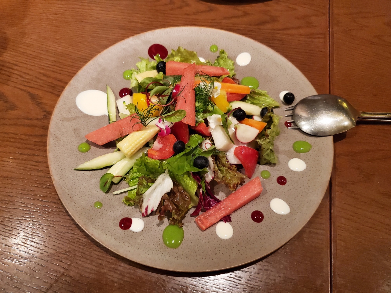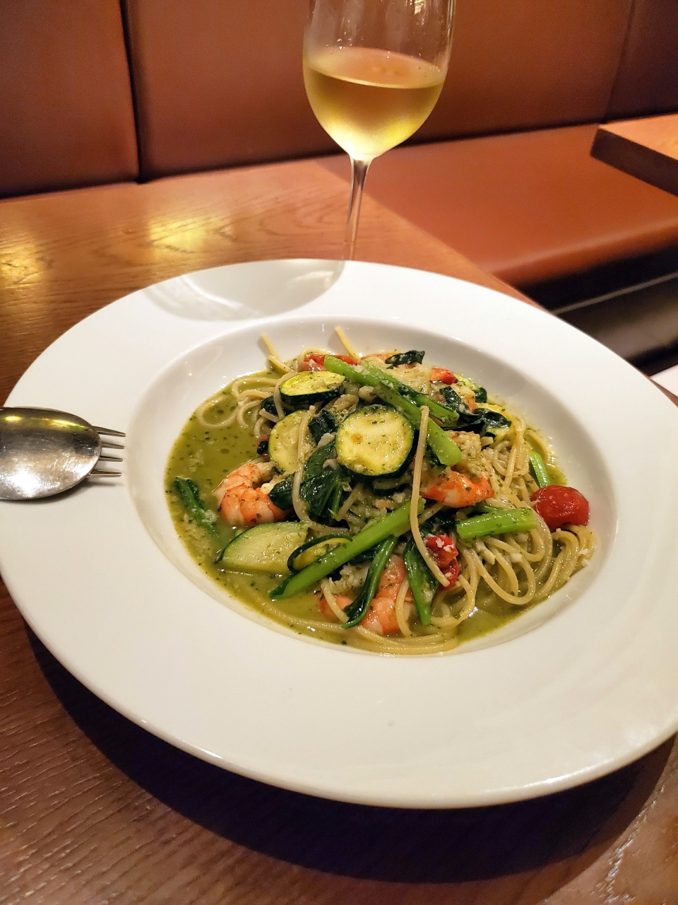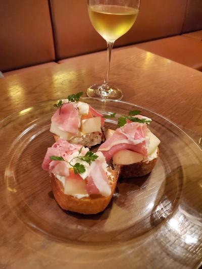 比較的リーズナブルにランチがいただけるお店ですが,今回は家内と夕食に訪店しました。フレンチということですが,色々と創作的なメニューが揃っています。今回は,アラカルトで,農園サラダ,白桃のブルスケッタ,ラクレット,海老とズッキーニのジェノベーゼパスタを,白ワイン(グラス)とともにいただきました。いずれの料理も趣向を凝らした一品で,美味しく,また,カジュアルなお店の雰囲気も良くて,満足しました。今回は,メインを頼まない軽めの夕食だったのですが,3000~4000ちょっとでコースもあるようです。
