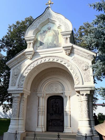 ツアーで入場観光。「カリヨンの鐘」の演奏(約5分)を鑑賞し,院内の教会や鐘楼の建物を写真撮影。修道院は,タタールとの攻防の舞台ともなっており,周囲は12の塔を持つ城壁に囲まれています。菜園の端に設置されている階段を昇って,城壁にも上ってみました。回廊になっており,回廊から中央門の塔(カッサ)の中に入ることができます。