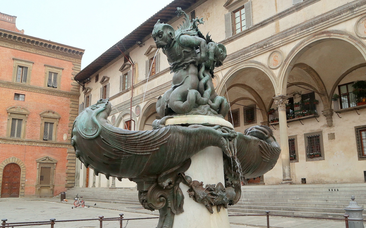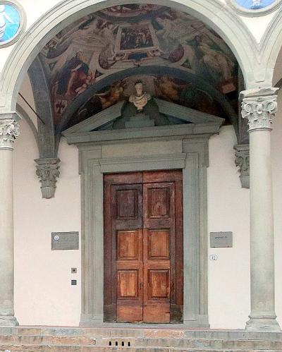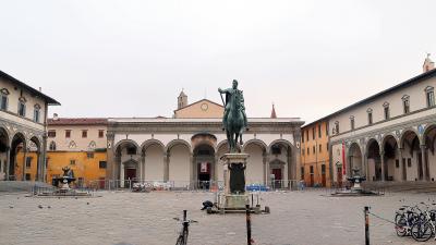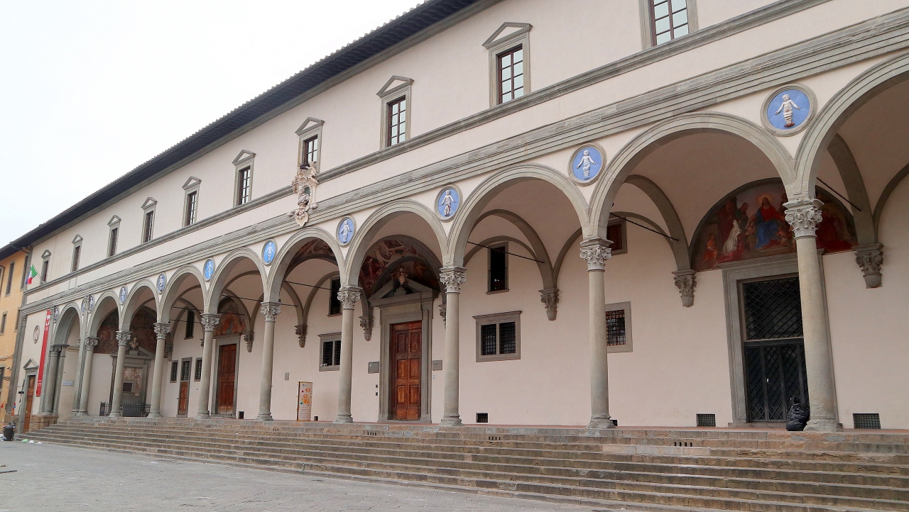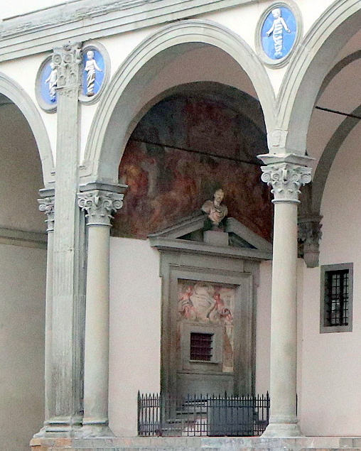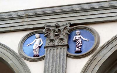 映画「冷静と情熱のあいだ」のロケ地,サンティッシマ・アンヌンツィアータ広場を訪問。広場右側の回廊の建物。ブルネッレスキの設計によって1417~36年に建設され,1445年に開院したヨーロッパ最古の孤児院であった建物で,現在美術館となっています(残念ながら入館せず)。回廊の奥には,赤ちゃんポストに相当するルオータと呼ばれる回転扉も残っています。柱の上の幼子のメダリオンは,アンドレア・デッラ・ロッビアによるもの。また,玄関は,映画「ハンニバル」で,レクター博士のフィレンツェでの滞在先の玄関として使われたようです。