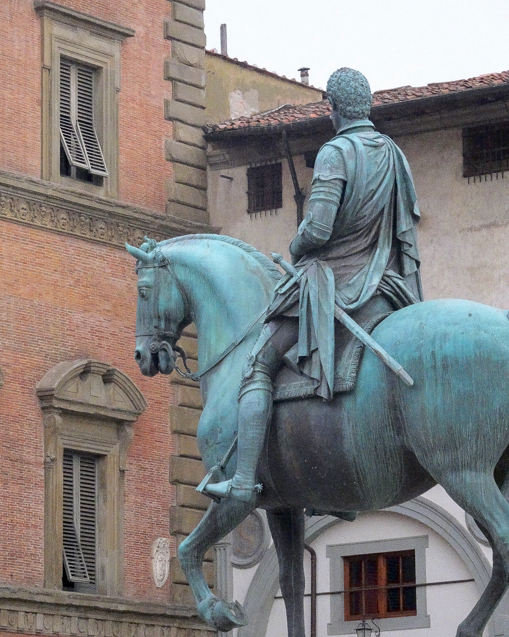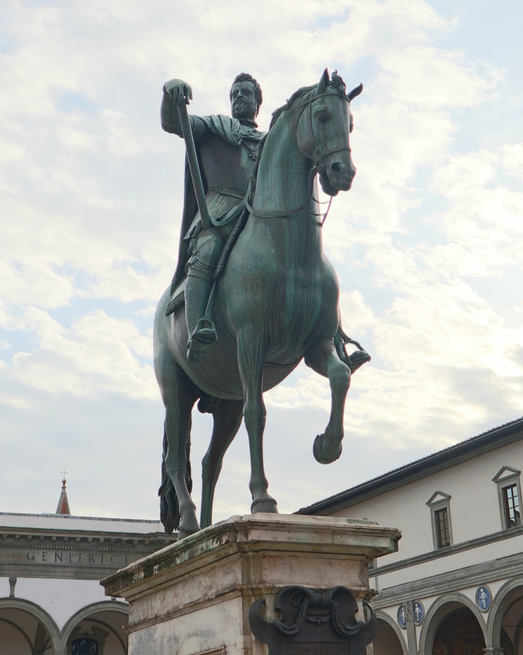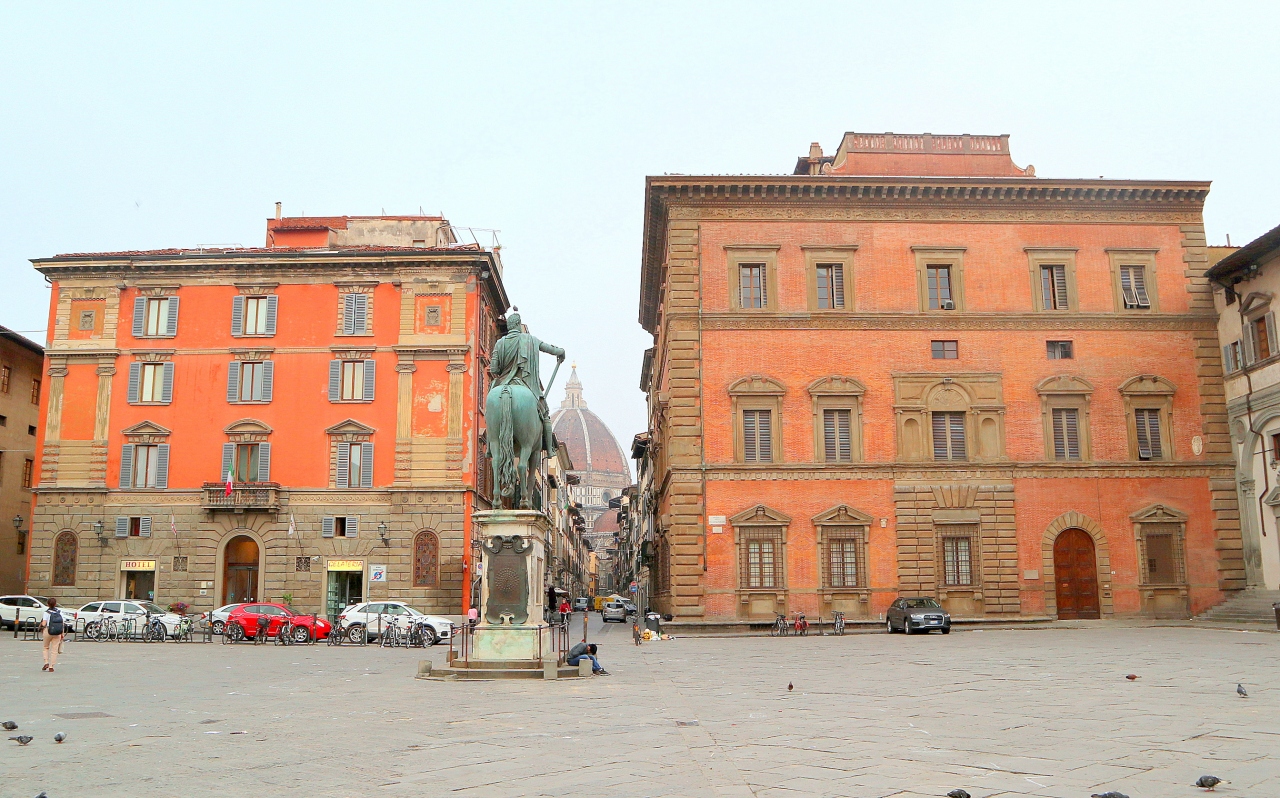 この広場は,映画「冷静と情熱のあいだ」で,ドゥオーモのクーポラで再会した順正とあおいが話をするシーンのロケに使われ,騎馬像越しにセルヴィ通りの向こうにドゥオーモの姿が見えるのが絵になるんです。