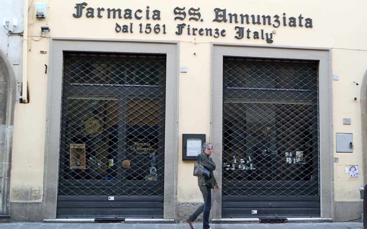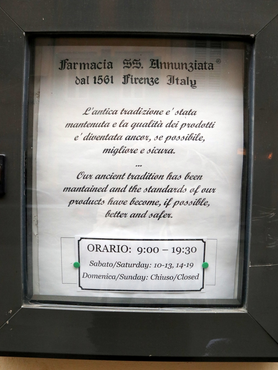 ドゥオーモ広場から北東のサンティッシマ・アンヌンツィアータ広場に至るセルヴィ通りの中ほど東側にある,創業1561年の老舗薬局。るるぶ誌にサンタ・マリア・ノヴェッラ薬局と並び紹介されています。ノヴェッラ薬局が有名になり過ぎて混雑しており,日本にも出店したことから,こちらの薬局の方が日本では手に入らない商品をおみやげにできるということで,土曜日の9時過ぎに訪店したのですが,開いていませんでした。ガイドブックには9時オープンとなっていましたが,土曜日は10時からのオープンでした。
