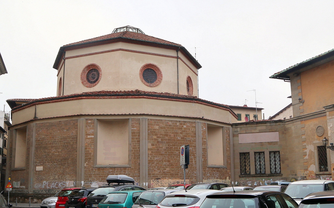 サンティッシマ・アンヌンツィアータ広場を訪問した際,外観の写真を撮影。広場の手前,セルヴィ通りから東に分かれるカステッラッチョ通りを進むと,駐車場(フィリッポ・ブルネッレスキ広場)の奥にある円筒形の建物。ブルネレスキが晩年にサンタ・マリア・デリ・アンジェリ礼拝堂として設計したもので,内側は八角形,外側は十六角形の集中式を採用した建物。フィレンツェ共和国がルッカと戦争になり,建築費用を軍事費に回してしまったため,未完に終わったもので,現在はフィレンツェ大学の語学センターとして使われています。