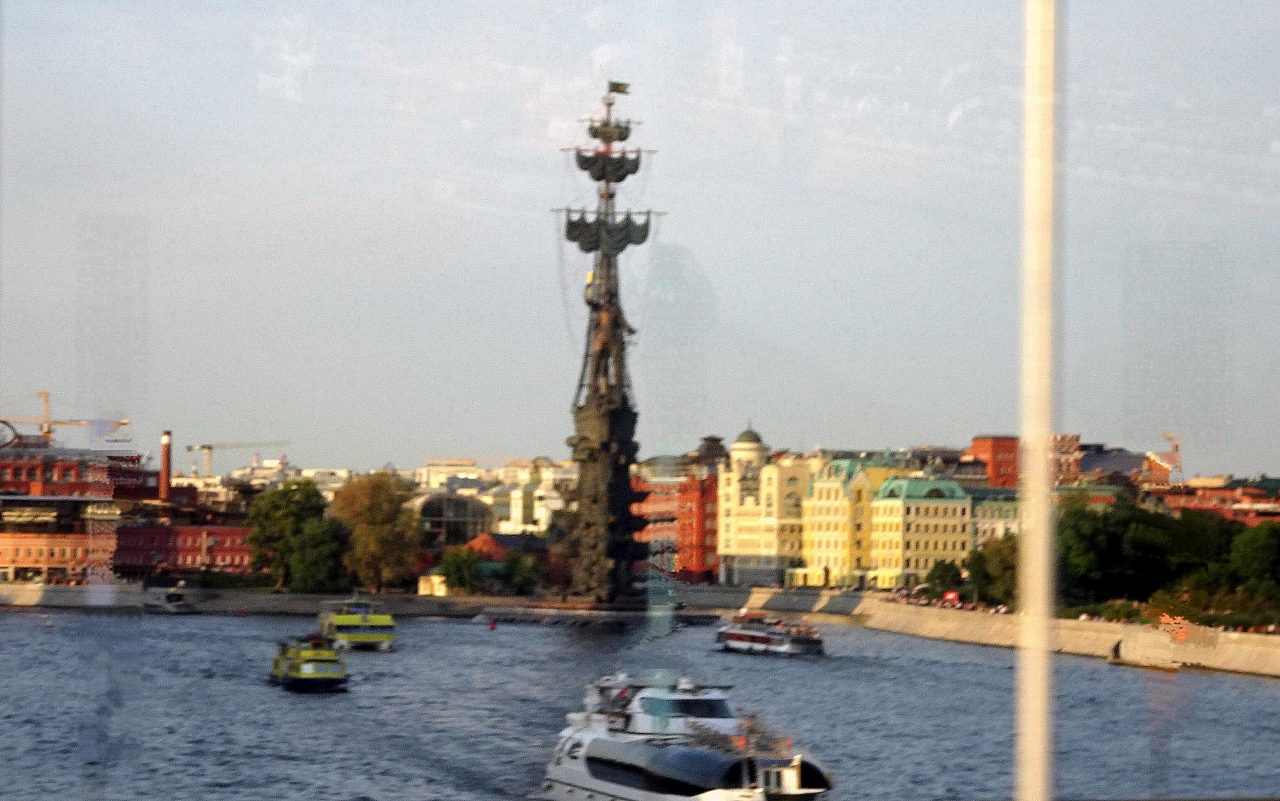 ツアーで,空港からモスクワ市内のホテルへの途上,バスでモスクワ川に架かる橋を渡った際,川の向こうに,はっきりそれとわかる存在感でそびえ立っていました。船をいくつか重ねた上に更に帆船,そしてピョートル大帝と,異様なモニュメントです。近くに救世主ハリストス大聖堂とかもあるので,時間が取れれば近くに行ってみたかったところです。