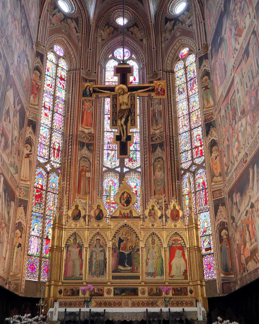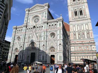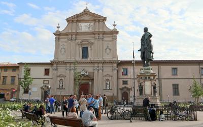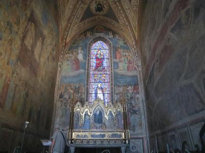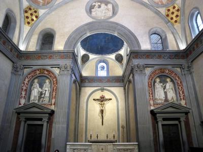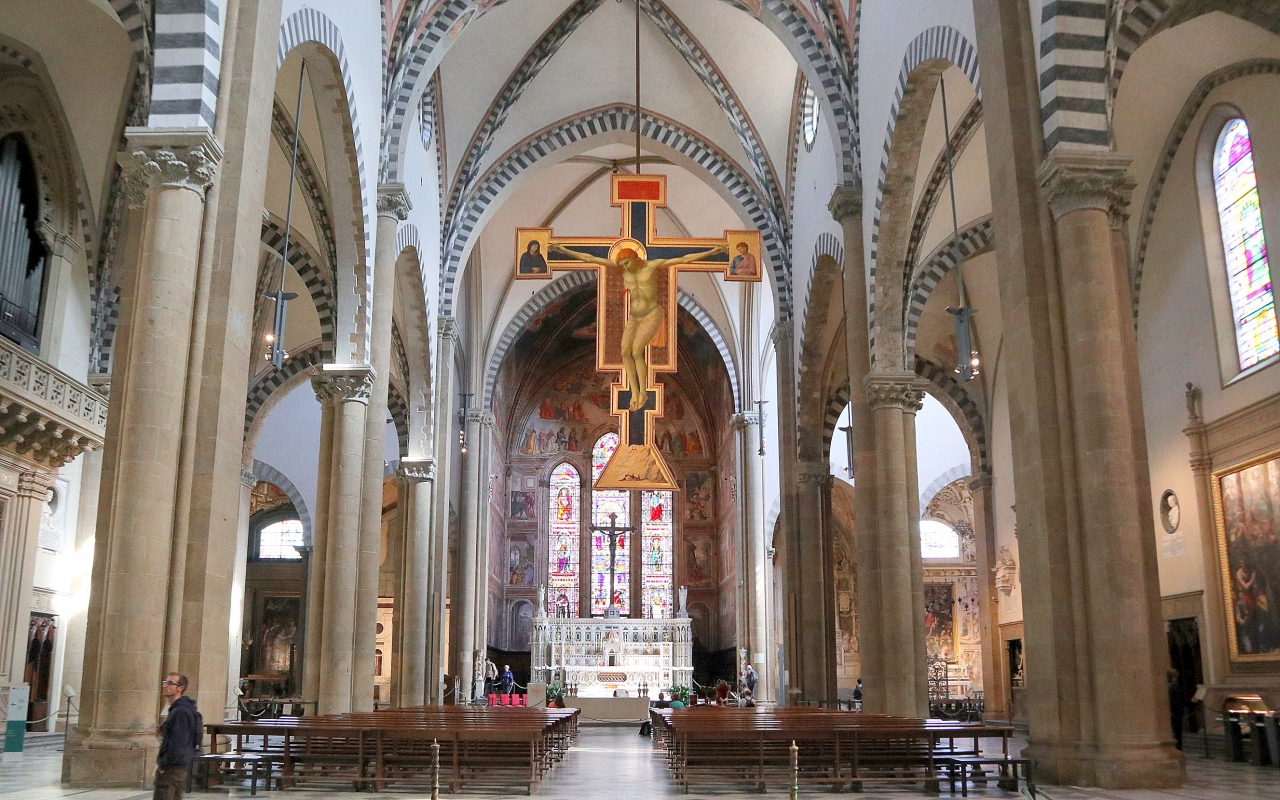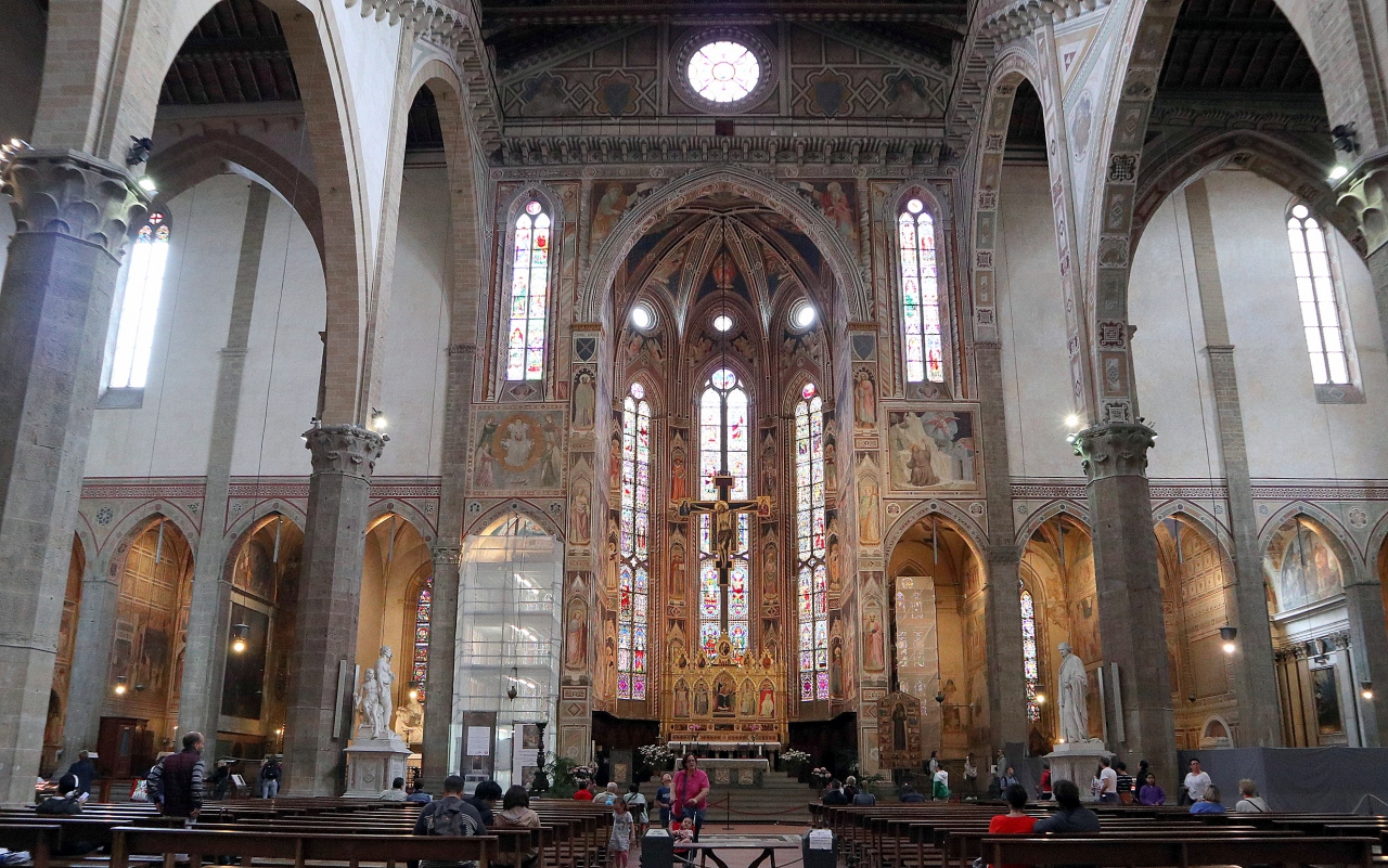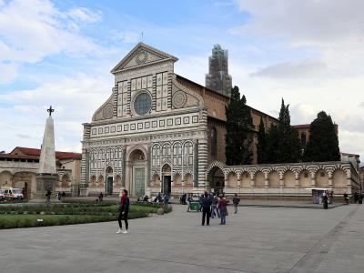 フラ・ヤコポ・タレンティとレオン・バッティスタ・アルベルティによる,色大理石を用いたファザードが美しく,左右上部の曲線部分が優美。フィレンツェの教会で一番好きなファザードです。内部も必見。フィレンツェカードを利用して入館しましたが,ここは無人の読み取り機にカードをかざす方式で,レシートは発行されませんでした。中央にぶら下がっているジョットの十字架像が存在感を示し,バラ窓のステンドグラスも精彩。奥の各礼拝堂はそれぞれ違ったモチーフのフレスコ画が描かれています。