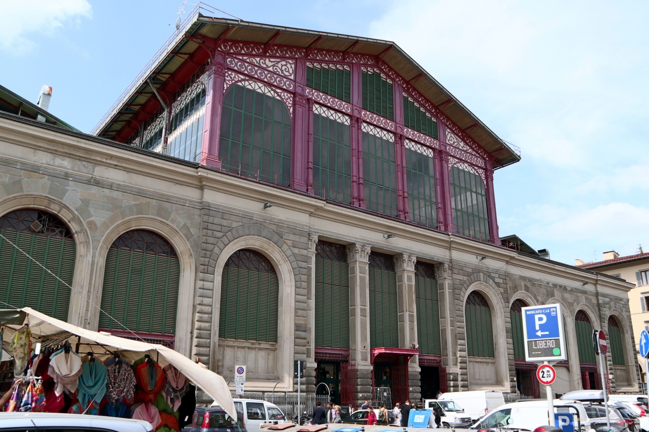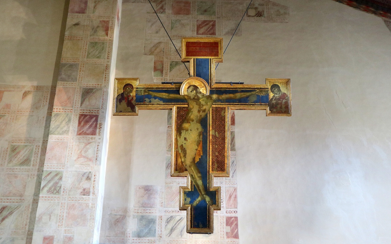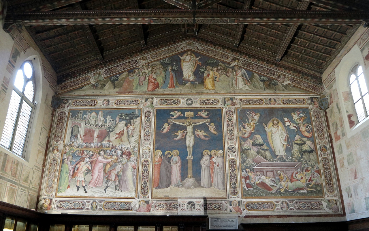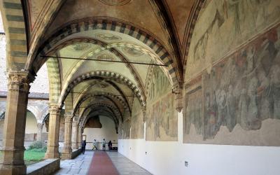 フラ・ヤコポ・タレンティとレオン・バッティスタ・アルベルティによる,色大理石を用いたファザードが美しく,左右上部の曲線部分が優美。フィレンツェの教会で一番好きなファザードです。内部も必見。フィレンツェカードを利用して入館しましたが,ここは無人の読み取り機にカードをかざす方式で,レシートは発行されませんでした。中央にぶら下がっているジョットの十字架像が存在感を示し,バラ窓のステンドグラスも精彩。奥の各礼拝堂はそれぞれ違ったモチーフのフレスコ画が描かれています。