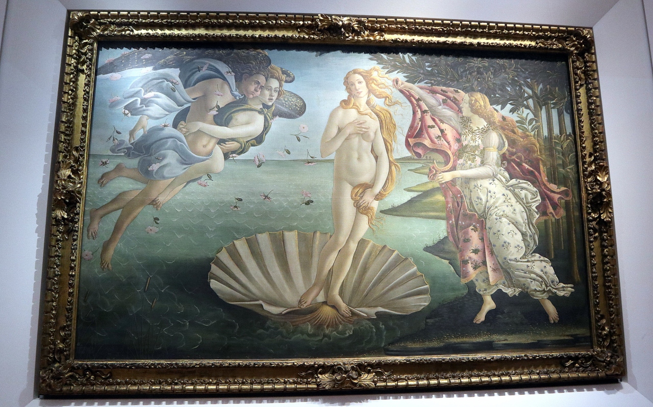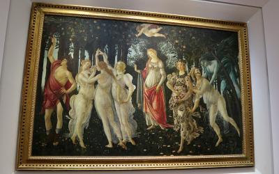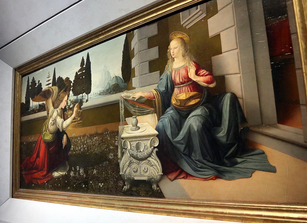 行列必至の美術館ですが,午後4時半ころに,フィレンツェカードを利用して10分ちょっとで入館できました。8年ぶり2回目の入館でしたが,レオナルド・ダ・ヴィンチの部屋をはじめ,改修されて2階の展示室が拡大されていました。また,写真撮影OKになっていたので,ボッティチェリの「ヴィーナスの誕生」や「春」などを写真に収め,ダ・ヴィンチの「受胎告知」は,CREA Traveller №50に紹介されていたように,右斜め下から撮影してみました。5年の歳月をかけたというダ・ヴィンチの「東方三博士の礼拝」の修復作業に関する映像展示もありました。