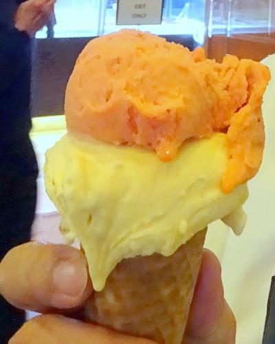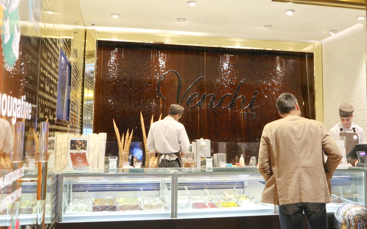 カルツァイウオリ通りにあるヴェンキ。今回は,コーンのジェラートを2つのフレーバー(キャラメルとストロベリー)でいただきました(3.2ユーロ)。お店の奥の壁一面がVenchiのロゴを覆うように流れるチョコレートシャワーになっていました。