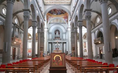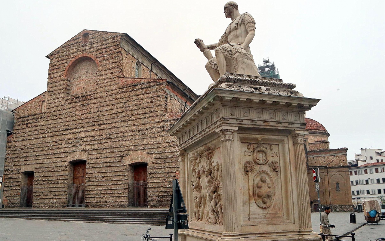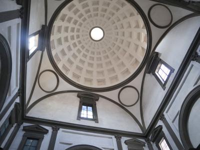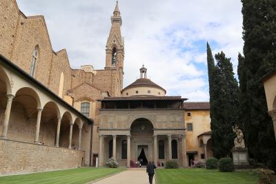15世紀にブルネレスキが設計して再建されたメディチ家の菩提寺。ミケランジェロに設計が依頼されたが未完のまま残った,煉瓦むき出しのファザードが印象的。フィレンツェカードを利用して入場。内部は,ドナテッロによる一対のブロンズ製の説教壇が存在感があるほかには,主祭壇は非常にシンプル。ブルネレスキが設計しドナテッロが装飾を担当した旧聖具室も見どころ。祭壇の小クーポラの天井画は,「1442年7月4日のフィレンツェの空」をテーマにしているということで,メディチ家のライバルであったパッツィ家の礼拝堂(サンタ・クローチェ教会内)の天井画と同じというのも面白い。