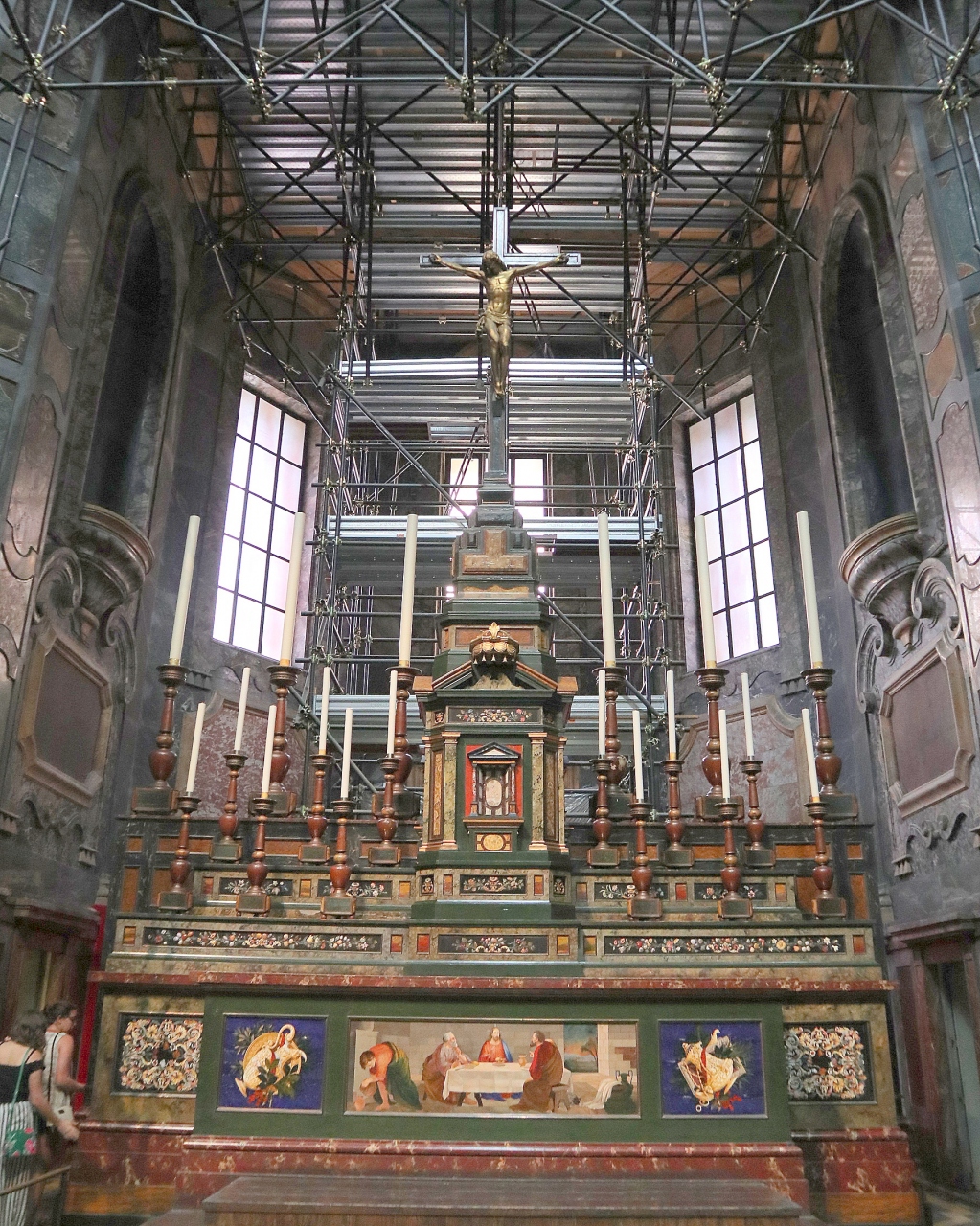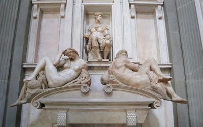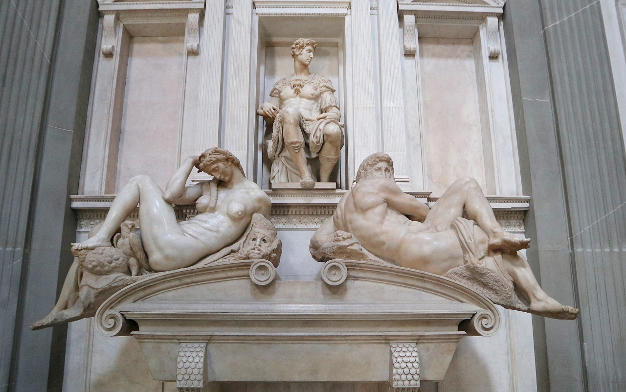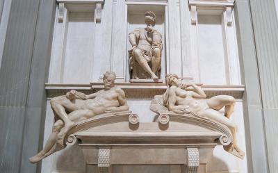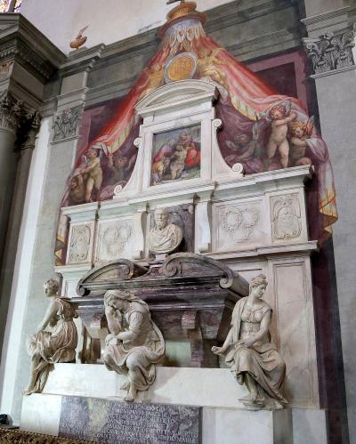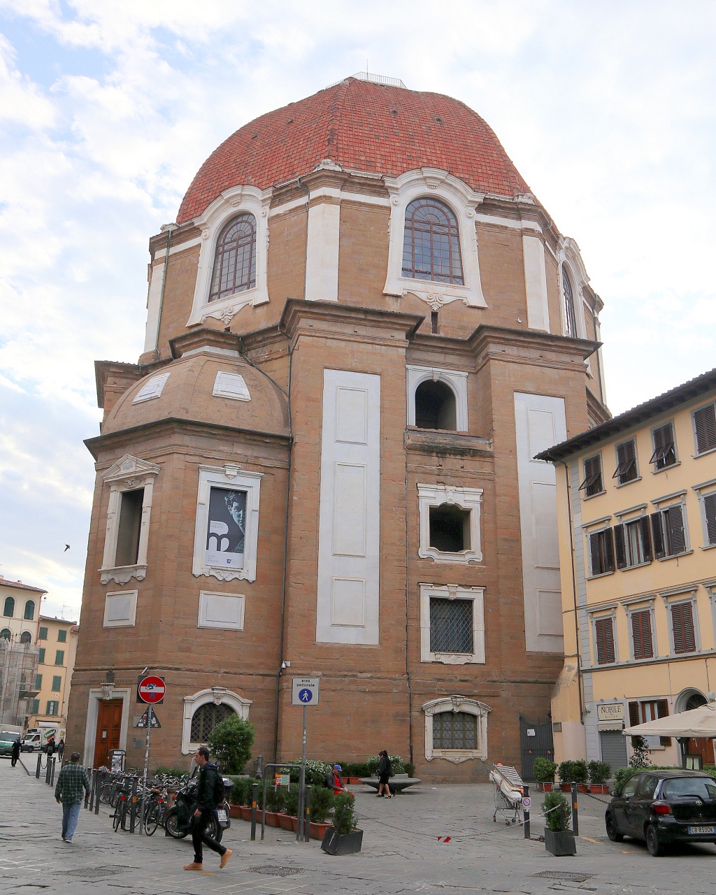 サン・ロレンツォ教会の後陣に接続するように建てられた礼拝堂。フィレンツェカードを利用して入場。君主の礼拝堂は,内部が大規模修繕中で,鉄骨の足場で覆われていて残念でしたが,クーポラの豪華な天井画は見ることができました。「夜」と「昼」,そして「夕暮れ」と「曙」の寓意像が据えられた墓碑がある,ミケランジェロ設計の新聖具室は,君主の礼拝堂に比較して,モノトーンでシンプル。そこへの通路は,うっかり見落としそうな感じなので,御注意を