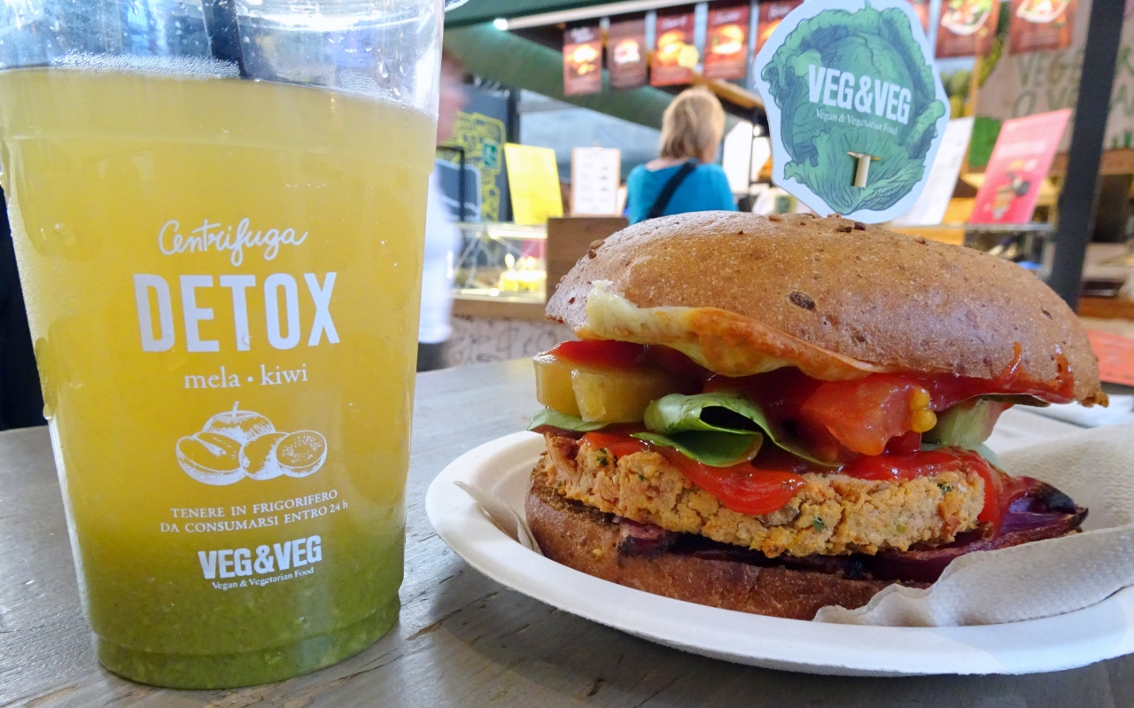 ランチに2階のフードコートに行きました。何かのイベントも催されていて,とても賑やかでした。ネット上で評判だったキアナ牛のハンバーガーが食べたかったのですが,正午前にもかかわらず売り切れていました。他のお店も色々見て回り,結局,ベジタリアンバーガーに挑戦。