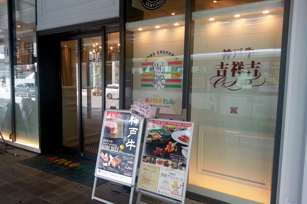 三宮中央通り沿いに2月9日にオープンした,神戸牛の吉祥グループが運営するクレープリー(2階が神戸牛の吉祥吉)。白と緑を基調としたヨーロピアン調の明るい店内。