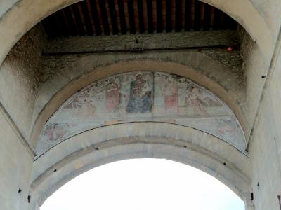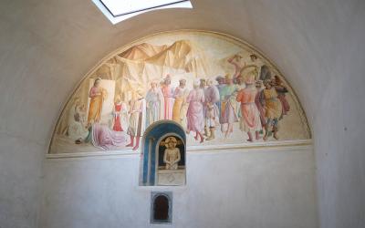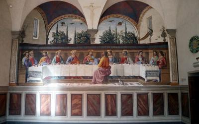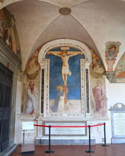 1階から階段を上がった正面の壁に描かれているのですが,この2階に上る階段の場所が「地球の歩き方」に掲載されている見取り図にも明示されておらず,階段に至る扉が閉められていたので,ちょっとわかりにくいんです。美術館を入ると,聖アントニーノの回廊に出ますが,正面の「十字架に祈る聖ドミニコ」のフレスコ画がある,その壁側の真ん中にある扉を入り,小食堂の手前にあるのがその階段です。