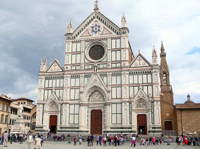 フランチェスコ会の拠点として建設。同じく美しいファザードを持ち,曲線が女性的なドミニコ会のサンタ・マリア・ノヴェッラ教会と対比して,こちらは男性的な印象。ミケランジェロ,ガリレオ,マキャベリ,ロッシーニなどの著名人の埋葬場所として有名で,「イタリアの栄光のパンテオン」とも呼ばれています。