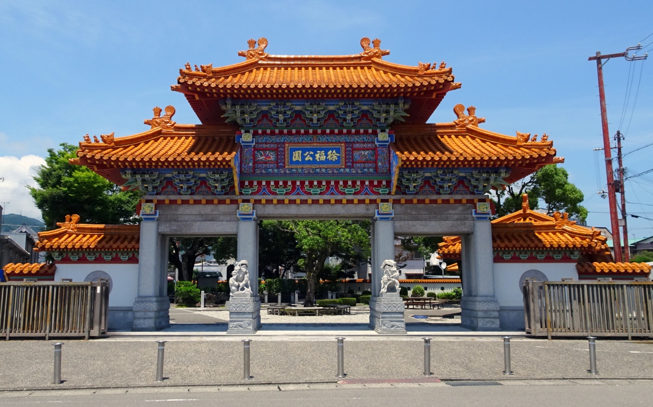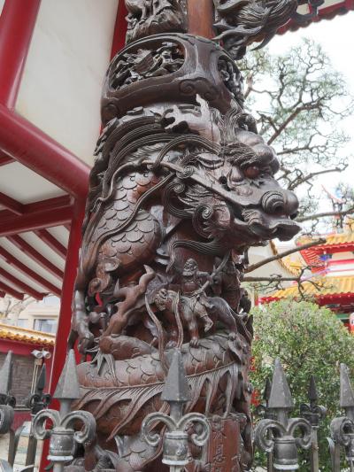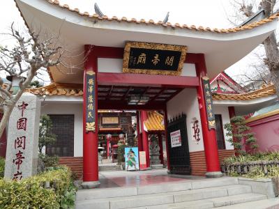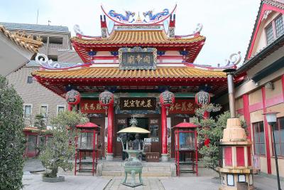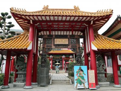 県庁前駅から西へ歩いて約10分。住宅街の中,紅い柱にオレンジ色の瓦が目を引きます。規模はそれほど大きくありません。山門をくぐって,すぐの「龍門」という扁額のかかった中門の一刀彫の柱が見事。黄河上流にある龍門の滝と呼ばれる急流を登りきれた鯉は龍になるという中国の故事になぞらえているもので(いわゆる登龍門),柱に巻き付くように龍が彫られており,中華と日本が融合した趣き。その奥に,向かい合う青龍を屋根にいだいた本堂は,いかにも中華の社殿。長い線香を持って,正式の作法でお参りされてる方がいました。