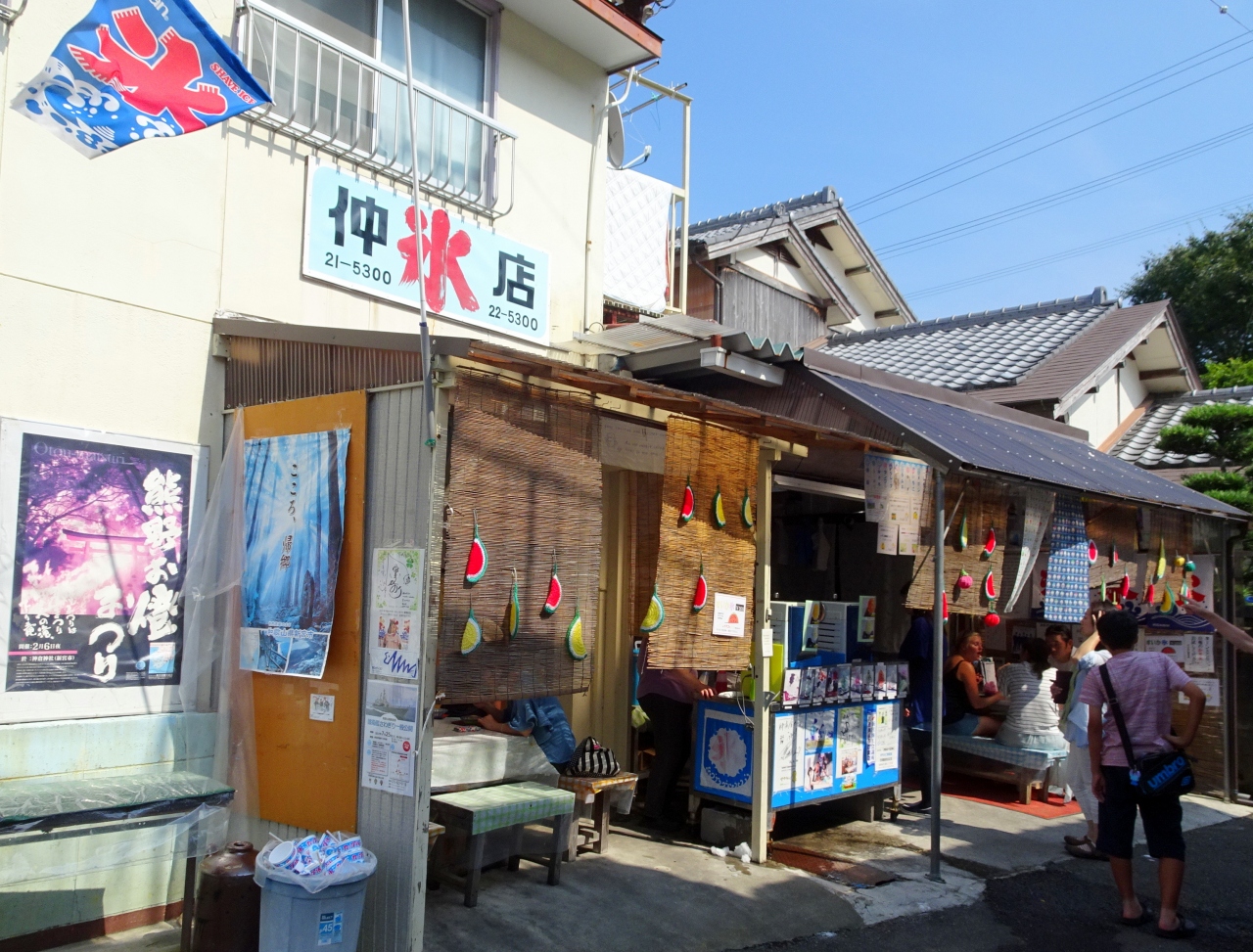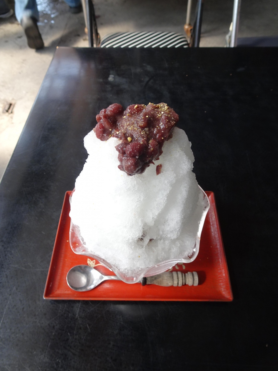 歩くだけで汗が滴るとなるような暑さの中,神倉神社の石段を登って汗だくとなり,かき氷にひかれて訪店。列ができるほどの人気店。じゃばら金時を注文しましたが,小倉あんを氷の間にも重ねられてて,てっぺんには金粉まで散らしてありました(600円)。時間をかけて製氷した純氷を使っているとのことで,冷たいけどキーンとこない氷に人心地しました。